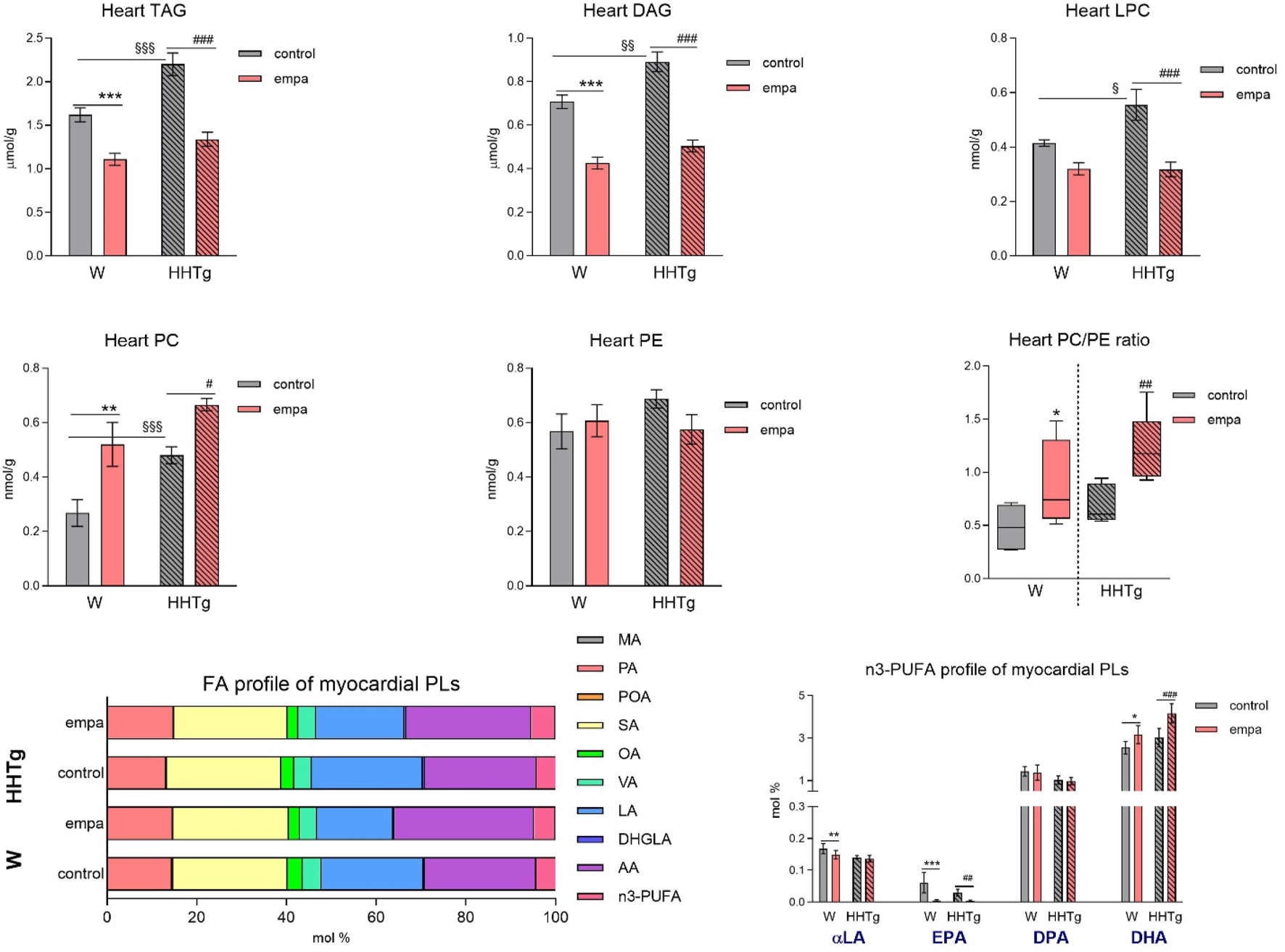 Effects of empagliflozin on the fatty acid profiles of lipids, phospholipids, lipotoxic intermediates, and phospholipids in the myocardium in Wistar control and prediabetic HHTg rats. Data are expressed as the mean ± SEM; n = 8 for each group and analyzed by two-way ANOVA with Fisher’s LSD post hoc test; * denotes significance reflecting the effect of empagliflozin in Wistar rats; # denotes significance reflecting the effect of empagliflozin in HHTg rats, § denotes significance between nontreated Wistar and HHTg rats; * denotes p < 0.05, ** denotes p ˂ 0.01 *** denotes p < 0.001; # denotes p ˂ 0.05,## denotes p ˂ 0.01, ### denotes p ˂ 0.001; § denotes p < 0.05, §§ denotes p < 0.01, §§§ denotes p < 0.001. HHTg, hereditary hypertriglyceridemic; W, Wistar; TAG, triacylglycerol; DAG, diacylglycerol; LPC, lysophospholipids; PLs, phospholipids; MA, myristic acid; PA, palmitic acid; POA, palmitoleic acid; SA, stearic acid; OA, oleic acid; VA, vaccenic acid; LA, linoleic acid; DHGLA, dihomo-γ-linoleic acid; AA, arachidonic acid; EPA, eicosapentaenoic acid; DPA, docosapentaenoic acid; DHA, docosahexaenoic acid.