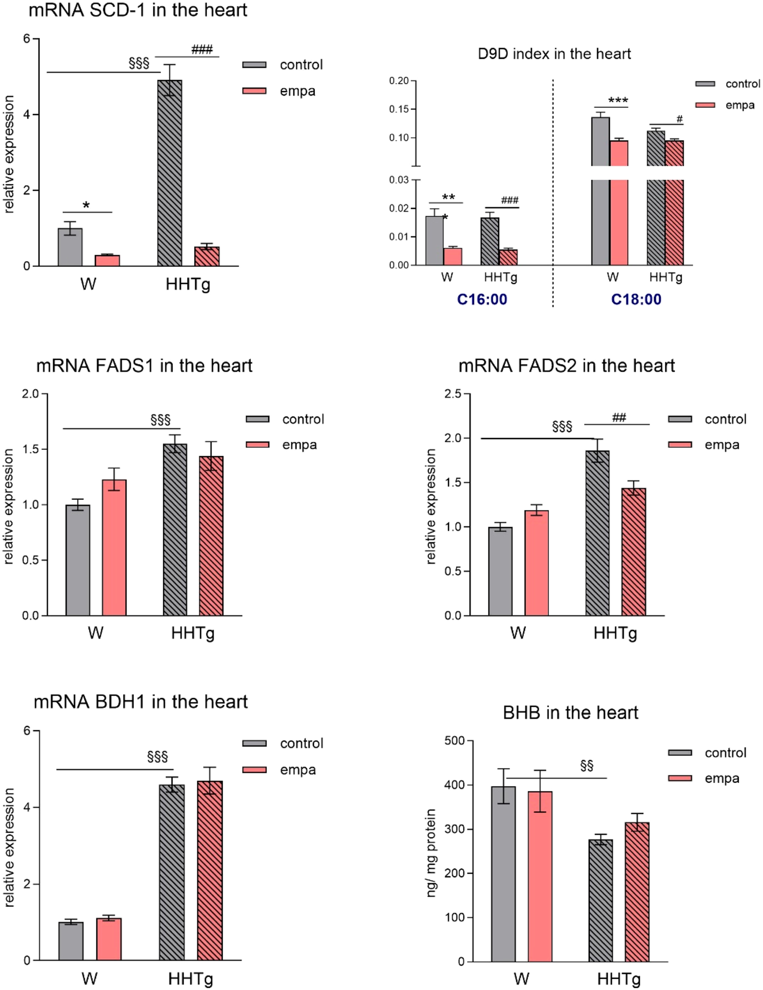 Effects of empagliflozin on parameters of lipid and ketone body metabolism in the myocardium–lipogenesis factors, desaturases, and ketone bodies in Wistar control and prediabetic HHTg rats. Data are expressed as the mean ± SEM; n = 8 for each group and analyzed by two-way ANOVA with Fisher’s LSD post hoc test; * denotes significance reflecting the effect of empagliflozin in Wistar rats; # denotes significance reflecting the effect of empagliflozin in HHTg rats, § denotes significance between nontreated Wistar and HHTg rats; * denotes p < 0.05, ** denotes p ˂ 0.01, *** denotes p < 0.001; # denotes p ˂ 0.05,## denotes p ˂ 0.01, ### denotes p ˂ 0.001; §§ denotes p < 0.01, §§§ denotes p < 0.001. HHTg, hereditary hypertriglyceridemic rats; W, Wistar rats; SCD-1, stearoyl-coenzym A desaturase; D9D, delta-9 desaturase; FADS, fatty acid desaturase; BHB, β-hydroxy butyrate; BDH1, β-hydroxybutyrate dehydrogenase 1.