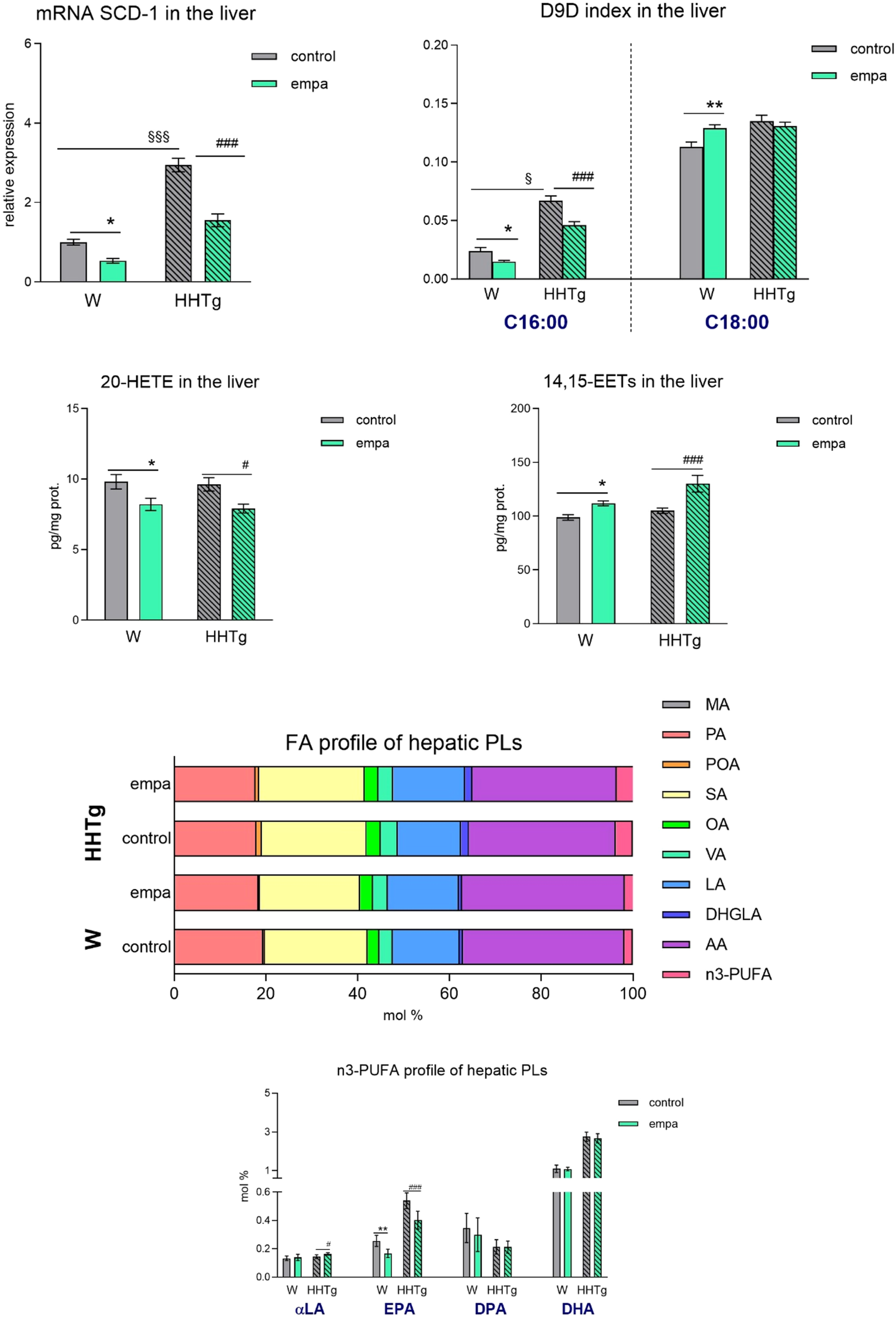Effects of empagliflozin on lipid and inflammatory markers in the liver: relative expression and activity of Scd-1, 20-HETE, 14–15 EET, and fatty acid profiles of hepatic phospholipids in Wistar control and prediabetic HHTg rats. Data are expressed as the mean ± SEM; n = 8 for each group and analyzed by two-way ANOVA with Fisher’s LSD post hoc test; * denotes significance reflecting the effect of empagliflozin in Wistar rats; # denotes significance reflecting the effect of empagliflozin in HHTg rats, § denotes significance between nontreated Wistar and HHTg rats; * denotes p < 0.05, ** denotes p ˂ 0.01; # denotes p < 0.05, ### denotes p ˂ 0.001; § denotes p < 0.05, §§§ denotes p < 0.001. HHTg, hereditary hypertriglyceridemic rats; W, Wistar rats; SCD-1, stearoyl-CoA desaturase 1; D9D, delta-9 desaturase; HETE, hydroxyeicosatetraenoic acid; EET, epoxyeicosatrienoic acid; PLs, phospholipids; MA, myristic acid; PA, palmitic acid; POA, palmitoleic acid; SA, stearic acid; OA, oleic acid; VA, vaccenic acid; LA, linoleic acid; DHGLA, dihomo-γ-linoleic acid; AA, arachidonic acid; EPA, eicosapentaenoic acid; DPA, docosapentaenoic acid; DHA, docosahexaenoic acid.