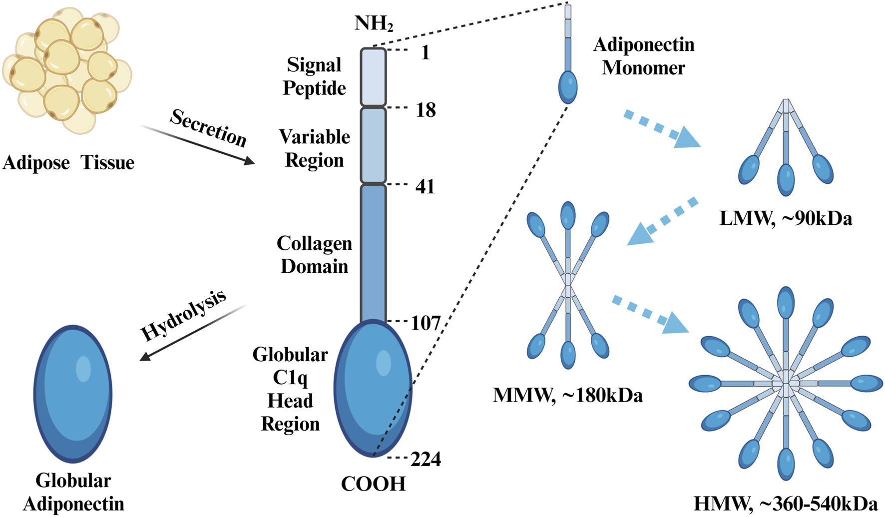 Protein Structure of APN. Adiponectin consists of an N-terminal signal peptide, variable region, collagen domain, and C-terminal globular c1q head region, with a total of 244 amino acids. Globular adiponectin is produced by proteolysis of full-length adiponectin. Three adiponectin monomers combine to form a trimer (LMW), two trimers combine to form a single hexamer (MMW), and four to six trimers combine to form a multimer (HMW). Created with BioRender.com.