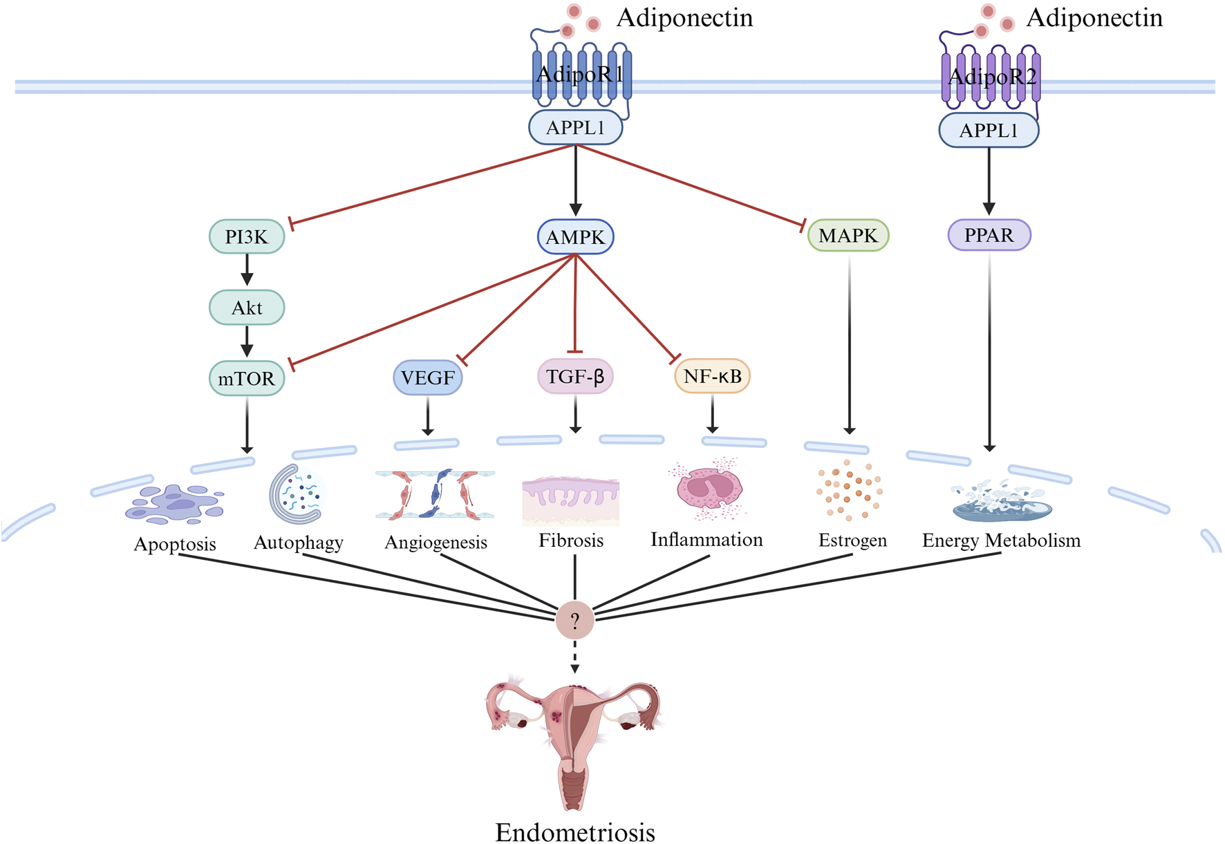 Adiponectin Signaling. Adiponectin signal transduction mainly depends on receptor ligand interaction, in which adiponectin binds to AdipoR1 and AdipoR2, and through AMPK,PPAR, PI3K/AKT, MTOR, MAPK, NF-κB, and other pathways initiate the activation of intracellular signal cascades and play a role in apoptosis, autophagy, inflammation, angiogenesis, fibrosis, energy metabolism, estrogen and other aspects, which may be related to the pathogenesis of endometriosis. Created with BioRender.com.