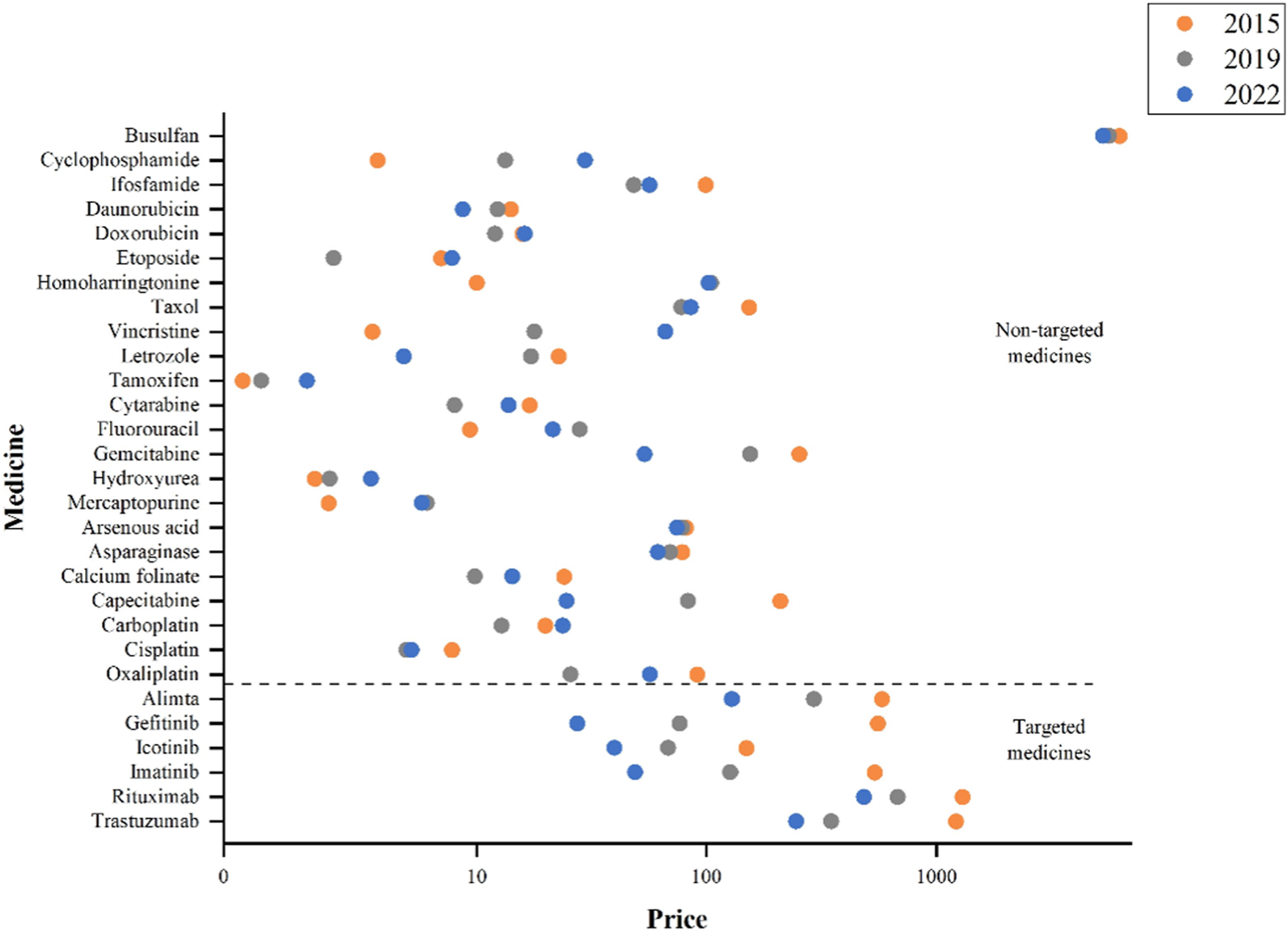 Overall, all the six targeted medicines exhibited a continuous decrease trend in price changes. Out of 23 non-targeted medicines, 4 (17·39%) experienced continuous increase in prices (Vincristine, Cyclophosphamide, Hydroxyurea and Tamoxifen), and 9 (39·13%) showed price decrease during 2015–2019 and then an upward trend during 2019–2022. For targeted medicines, the prices dropped significantly from 2015 to 2019 (p = 0.028) and 2019 to 2022 (p = 0.028), but the results for non-targeted drugs were not significant (Table 1).