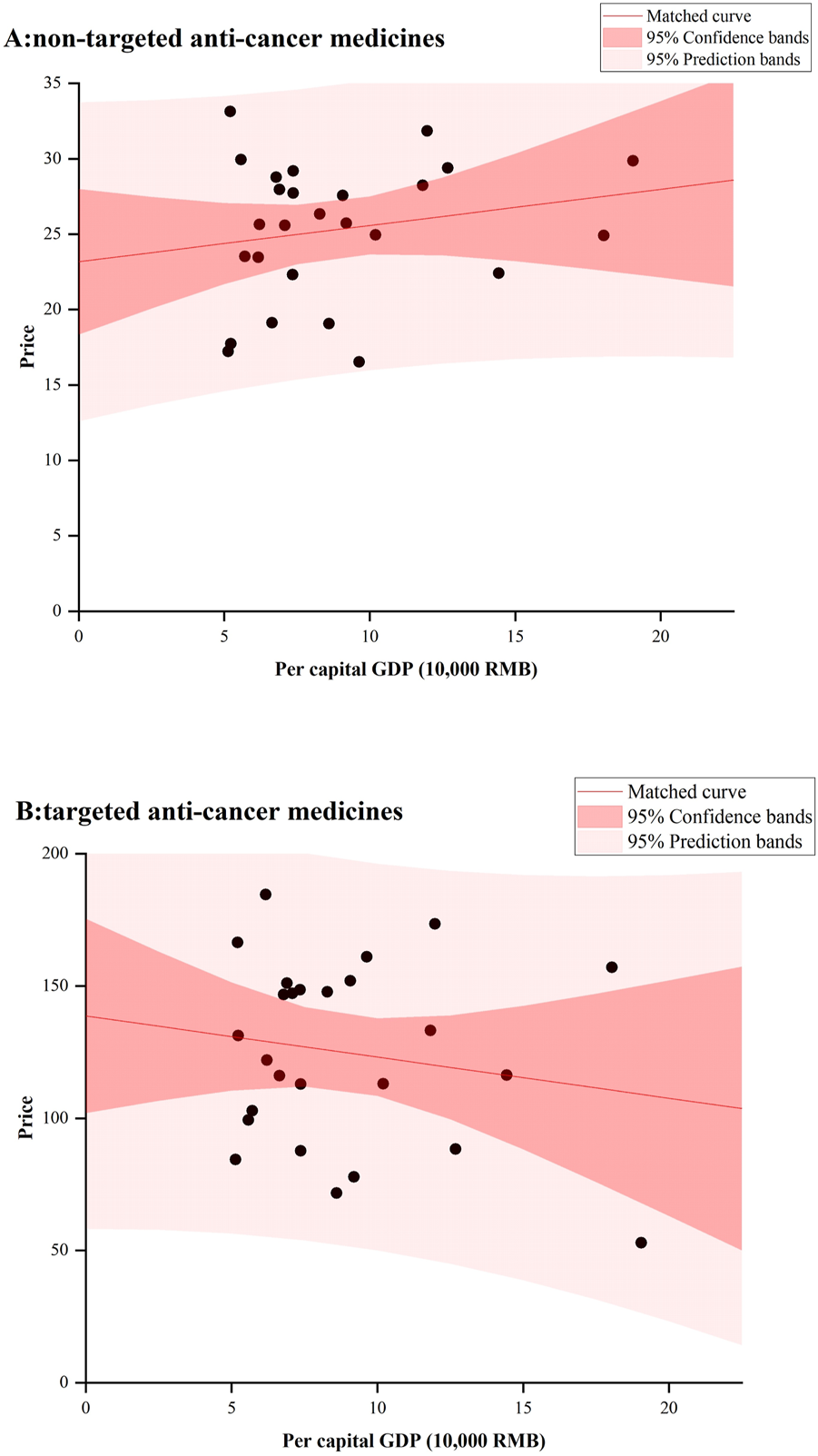 Scatterplots were utilized to explore the relationship between provincial median price of anticancer medicines and per capita Gross Domestic Product (GDP) in 2022.