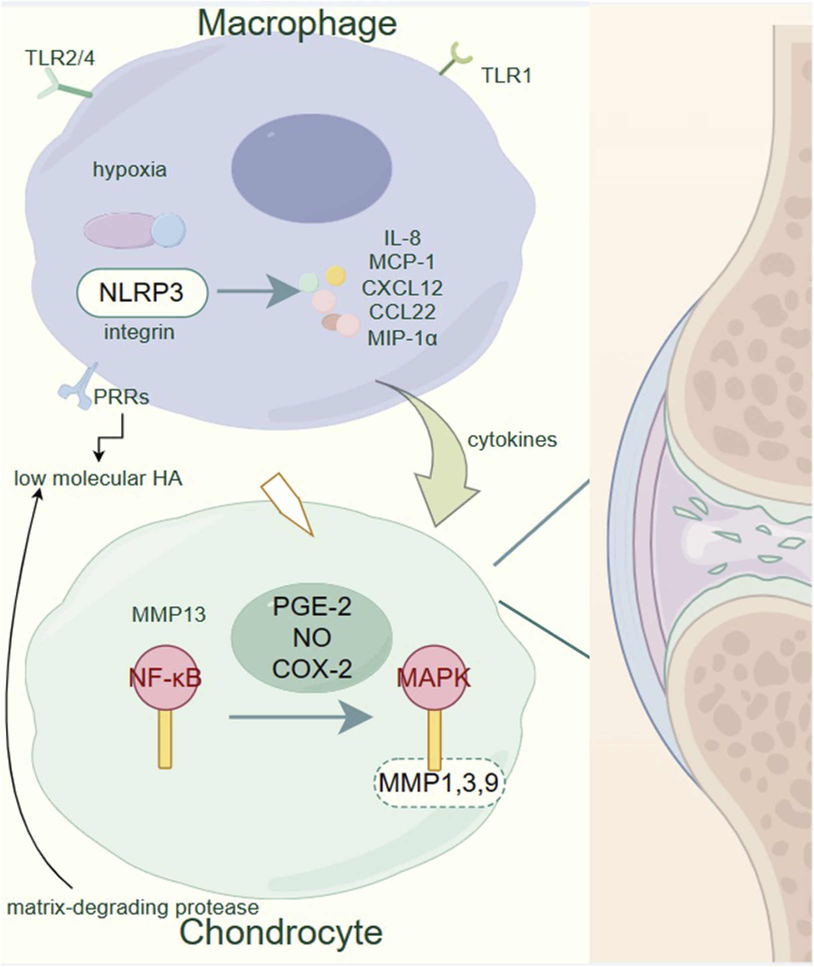 As ECM breaks down, it releases various molecular fragments that act as DAMPs, further activating PRRs on macrophages and chondrocytes (Son et al., 2020; Lambert et al., 2021; Foell et al., 2007; Rahmati et al., 2016; Hügle et al., 2022). This perpetuates the inflammatory cycle, enhancing the activation of NF-κB and MAPK pathways, and accelerating cartilage degradation (Moon et al., 2018; Liao et al., 2020; Xu et al., 2022; Boehme and Rolauffs, 2018). Additionally, hypoxia within the joint microenvironment exacerbates inflammation, activating the NLRP3 inflammasome in macrophages and leading to the release of pro-inflammatory cytokines such as IL-8, MCP-1, CXCL12, CCL22, and MIP-1α (Quero et al., 2020; Raghu et al., 2017; Kuang et al., 2020; Ren et al., 2021; Hou et al., 2020; Zhao et al., 2020). These cytokines contribute to the recruitment and activation of additional immune cells, further perpetuating the inflammatory cycle (Nelson et al., 2011) (Figure 1).
