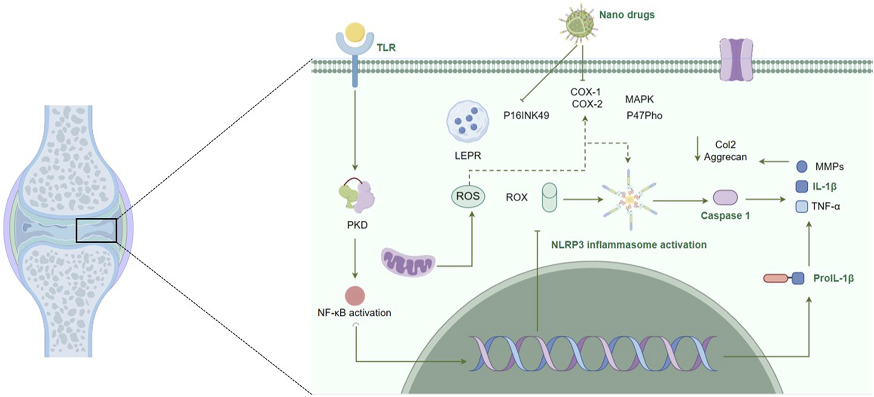 Nanomedicines and their immune regulatory role in osteoarthritis. This figure depicts the multifaceted mechanisms of action of nanomedicines in the regulation of immune responses within the pathophysiological context of osteoarthritis. It illustrates the targeted delivery and sustained release of nanoformulated drugs, highlighting their interactions with cellular and molecular components are integral to the inflammatory process and consequent cartilage degradation in osteoarthritis. The figure underscores the potential of nanomedicines to reduce inflammation by inhibiting these pathways and to enhance the bioavailability and efficacy of therapeutic agents, offering a strategic approach in osteoarthritis treatment.