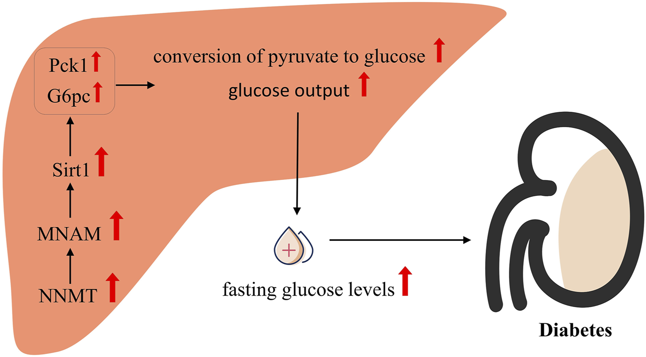 The potential mechanisms underlying NNMT’s regulation of glucose metabolism are primarily derived from two key reports. Kraus et al. (Kraus et al., 2014) demonstrated that reduced NNMT expression enhances glucose tolerance and improves insulin sensitivity in DIO mice. The role of NNMT in gluconeogenesis was further elucidated by Hong et al. (Hong et al., 2015). Their results revealed that decreasing NNMT expression in primary hepatocytes led to a reduction in the expression of phosphoenolpyruvate carboxykinase 1 (Pck1) and glucose-6-phosphatase (G6pc), resulting in decreased glucose output. Conversely, increasing NNMT expression in primary hepatocytes resulted in elevated glucose output and increased expression of Pck1 and G6pc. Furthermore, Hong et al. (Hong et al., 2015) observed that mice subjected to NNMT knockdown exhibited reduced fasting glucose levels and diminished conversion of pyruvate to glucose. Such observations indicate that NNMT plays a beneficial role in regulating gluconeogenesis in hepatocytes.