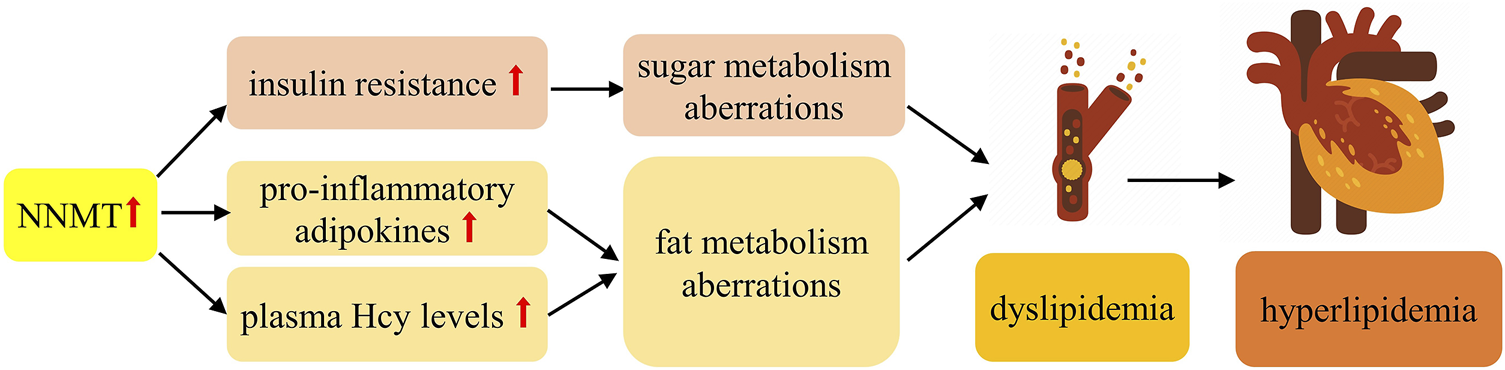 The etiology of hyperlipidemia remains incompletely elucidated; however, it is widely believed to be linked to aberrations in both sugar and fat metabolism. Epidemiological investigations have underscored a significant correlation between hyperlipidemia and conditions such as obesity or disruptions in energy metabolism (Zhu et al., 2016). Numerous studies have underscored a robust association between obesity and dyslipidemia (Vekic et al., 2019). As shown in Figure 4, Evidence suggests that dyslipidemia predominantly stems from IR and the influence of pro-inflammatory adipokines (Klop et al., 2013). Consequently, it is plausible that NNMT’s involvement in hyperlipidemia is mediated through its impact on both sugar and fat metabolism. Moreover, NNMT might contribute to hyperlipidemia by influencing plasma Hcy levels. Multiple studies have highlighted a pronounced link between plasma Hcy levels and hyperlipidemia (Sreckovic et al., 2017; Hasan et al., 2019). Additionally, Mondal et al. (Mondal et al., 2018) demonstrated that elevated homocysteine levels can directly modulate lipid metabolism and induce hyperlipidemia in rats through Hcy administration (50 mg/kg/d).