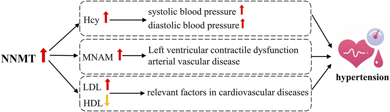 While direct evidence linking NNMT activity to hypertension is currently lacking, numerous studies have established a strong association between NNMT activity and various metabolic disorders, including cardiovascular diseases (Li et al., 2006; Williams et al., 2012). For instance, Liu et al. (Liu et al., 2017) demonstrated a significant association between serum MNAM levels and coronary artery disease, as well as left ventricular systolic dysfunction in Chinese patients (Liu M. et al., 2018). Additionally, Bubenek et al. (Bubenek et al., 2012) reported a robust association between NNMT expression, serum MNAM levels, and the onset and progression of peripheral arterial occlusive disease. Notably, NNMT expression has been found to be positively correlated with LDL levels and negatively correlated with HDL levels, both of which are relevant factors in cardiovascular diseases (Herfindal et al., 2020; Kornev et al., 2023; Rus et al., 2023). As shown in Figure 5, left ventricular contractile dysfunction and arterial vascular disease are significant contributors to the development of hypertension, suggesting a potential pathway through which NNMT may influence hypertension. Moreover, elevated plasma Hcy levels have been significantly associated with hypertension (Van Guldener et al., 2003), particularly with systolic blood pressure (SBP) (Esteghamati et al., 2014). Junedi et al. (Junedi et al., 2022) reported higher Hcy levels in hypertensive cases compared to controls. Moreover, increased plasma Hcy levels were associated with elevated SBP, diastolic blood pressure (DBP), and a higher prevalence of hypertension among middle-aged and elderly individuals of Chinese descen (Hidru et al., 2019). Notably, patients with HHcy exhibit significantly higher blood pressure compared to those without HHcy, and serum Hcy levels have been positively correlated with blood pressure in Wistar rats (Shi et al., 2019). Thus, influencing Hcy levels may represent another important pathway through which NNMT is implicated in the development of hypertension.