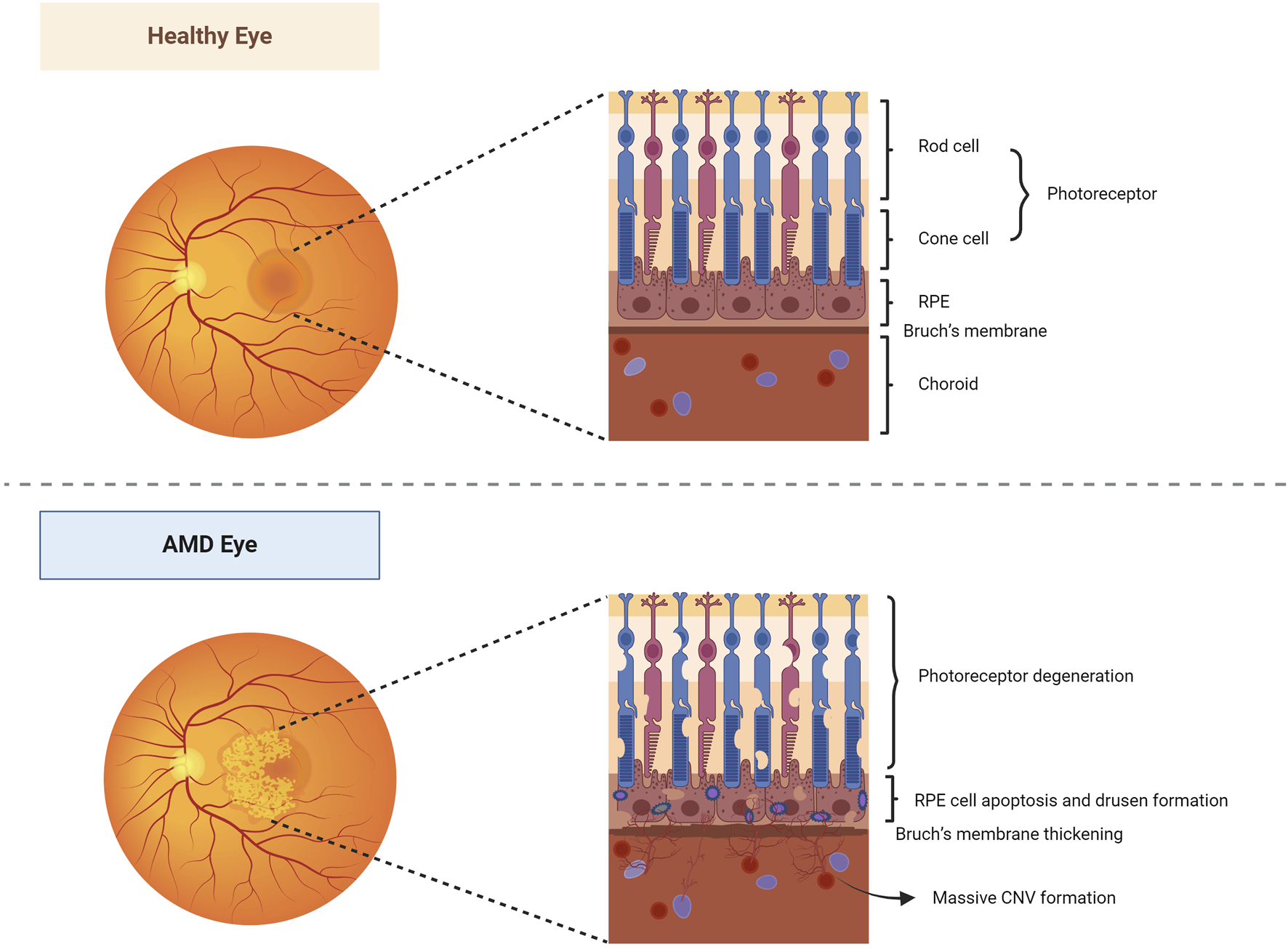Healthy and AMD-affected eyes. In healthy eyes, the fundus is normal, and the morphology and structure of the photoreceptor cells, RPE layer, Bruch’s membrane, and choroidal layer in the macula are normal. In AMD eyes, the pigmentation of the macular area was disorganized, and a slightly elevated neovascular membrane could be seen locally. Its photoreceptor cells, RPE, Bruch’s membrane, and choroidal multilayer organization changed constantly, resulting in degeneration of photoreceptor cells, apoptosis of RPE cells, pigmentation production, thickening of Bruch’s membrane, and formation of a large number of CNV. Abbreviations: AMD, age-related macular degeneration; RPE, retinal pigment epithelium; CNV, choroidal neovascularization.