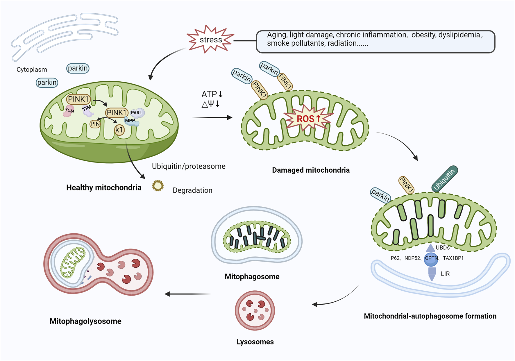 Mitophagy activation mediated by PINK1/Parkin. In healthy mitochondria, PINK1 is transported to mitochondria via TOM and TIM, cleaved by PARL and MPP, and then translocated to the cytoplasm, where it is broken down by the ubiquitin/proteasomal pathway. In response to various stressors, the level of ROS production rises, inducing oxidative damage. PINK1 recognizes damaged mitochondria, accumulates in large quantities in the mitochondrial outer membrane, and recruits and phosphorylates Parkin, activating its E3 ubiquitin ligase function. Both proteins translocate from the cytoplasm to the mitochondrial outer membrane and ubiquitinate mitochondrial proteins by forming polyubiquitin chains. Autophagy-related proteins (e.g., P62, NDP52, OPTN, TAX1BP1) then recognize ubiquitinated mitochondria through UBDs on the one hand, and on the other hand, are anchored to the membrane of autophagic vesicles through the LIR to form mitochondrial autophagosomes, which subsequently merge with lysosomes, leading to mitochondrial degradation. Abbreviations: PINK1, phosphatase and tensin homolog (PTEN)-induced kinase 1; TOM, translocase of outer membrane; TIM, Translocase of inner membrane; PARL, presenilin-associated rhomboid-like; MPP, mitochondrial-processing protease; ROS, reactive oxygen species; NDP52, nuclear dot protein 52; OPTN, optineurin; TAX1BP1, TAX1‐binding protein‐1; UBDs, Ubiquitin-binding domains; LIR, LC3-interacting region.