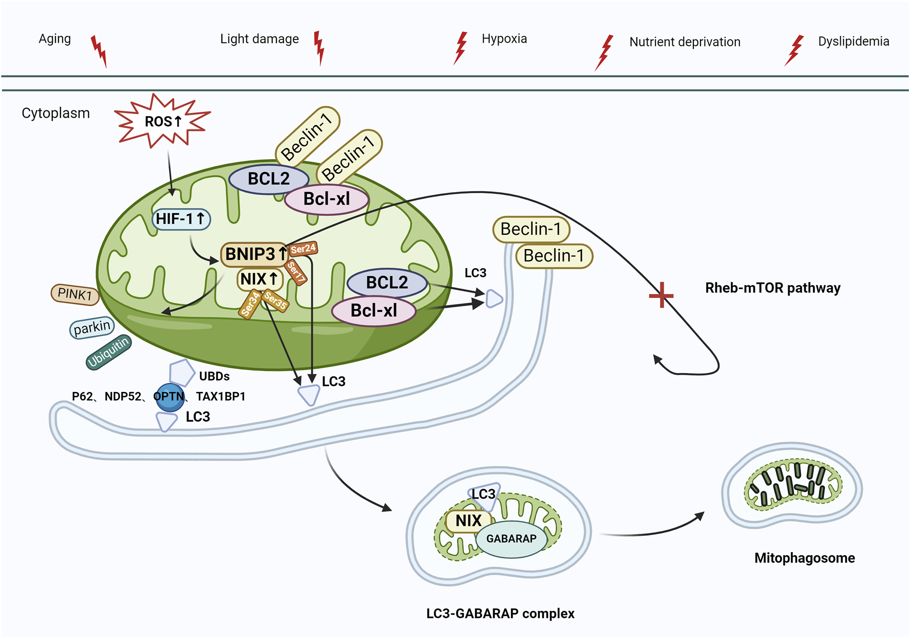 Mitophagy activation mediated by BNIP3/NIX. Under stress (e.g., aging, light damage, hypoxia, nutrient deprivation, and dyslipidemia), elevated levels of ROS activate HIF-1, leading to the upregulation of BNIP3/NIX, which interacts with the Beclin-1/BCL-xl and Beclin-1/BCL2 complexes, releasing Beclin-1, which activates autophagy. BNIP3/NIX-mediated mitophagy can also be regulated by phosphorylation. Ser17 and Ser24 phosphorylated on BNIP3 bind to LC3 via LIR, whereas Ser34 and Ser35 phosphorylated on NIX bind to LC3, and then bind to the GABAR complex to form the LC3-GABARAP complex, which targets LC3 to damaged mitochondrial outer membrane, and eventually initiates mitophagy. In addition, BNIP3 plays a role in the control of ubiquitin-dependent mitophagy by initiating mitochondrial movement of Parkin and facilitating Parkin-mediated mitophagy (process as in Figure 3). Finally, BNIP3 inhibits the Rheb-mTOR pathway, which also leads to autophagy activation. Abbreviations: BNIP3, BCL2-interacting protein 3; NIX, NIP3-like protein X; ROS, reactive oxygen species; HIF-1, Hypoxia-inducible factor-1; LC3, Microtubule-associated protein 1 light chain 3; LIR, LC3-interacting region; GABARAP, GABA type A receptor-associated protein; Rheb, Ras homologue enriched in brain; mTOR, target of the rapamycin machinery.