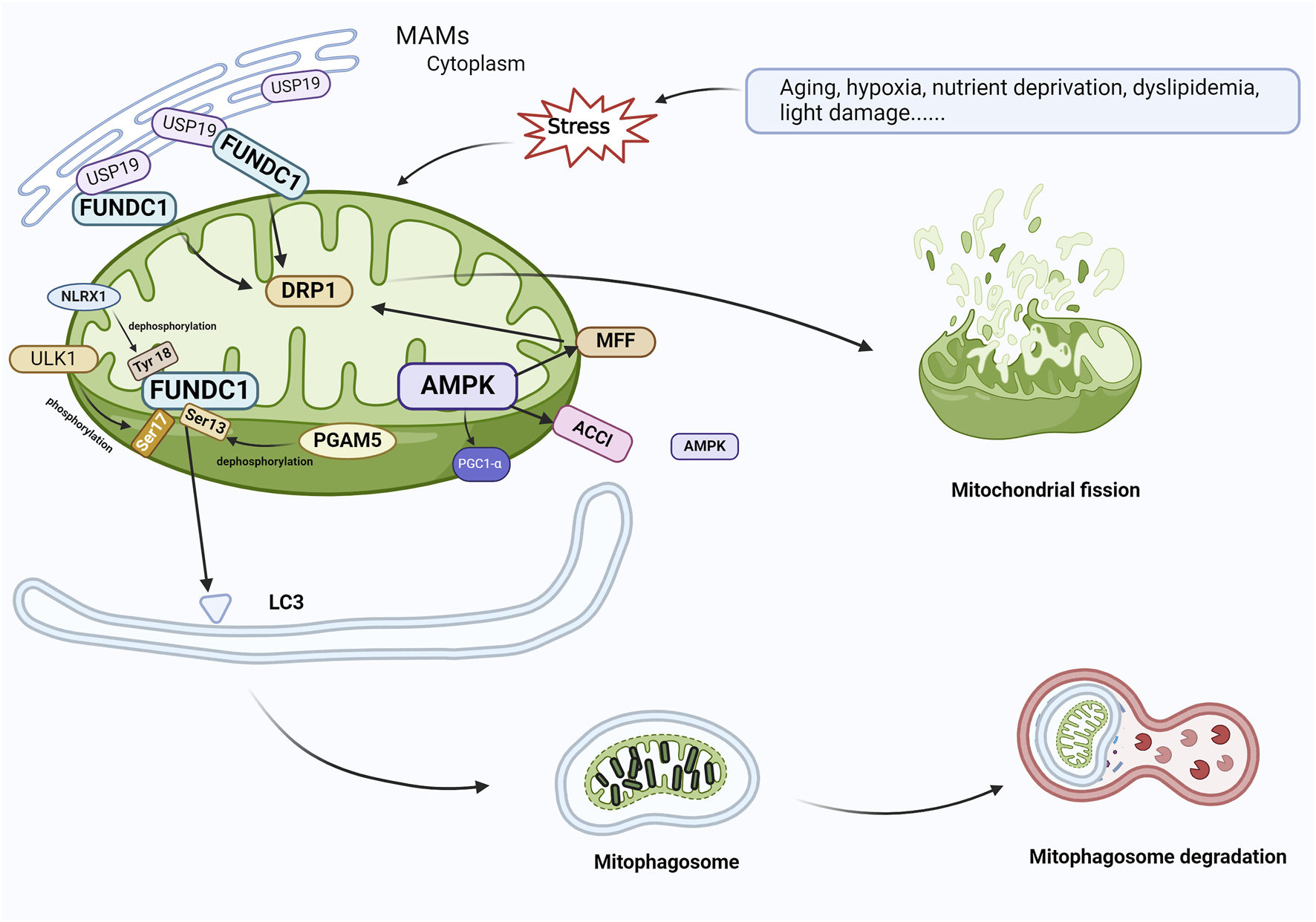 FUNDC1 and AMPK are involved in the regulation of mitophagy. In response to cellular stress, PGAM5 induces the dephosphorylation of Ser13, and FUNDC1 and LC3 interact to induce mitophagy. At the same time, USP19, which accumulates on MAM, attaches to FUNDC1 and triggers deubiquitination of FUNDC1, which promotes oligomerization of DRP1 and leads to mitochondrial fission. ULK1 complex translocates to mitochondria and phosphorylates Ser17 of FUNDC1 to initiate mitophagy, and NLRX1 activates FUNDC1 by dephosphorylating FUNDC1 Tyr 18 and induces mitophagy. During AMPK-mediated mitophagy, ACCl and MFF on the mitochondrial outer membrane, which are substrates for the action of AMPK, contact AMPK in the cytoplasm, resulting in the localization of AMPK within or near mitochondria. AMPK phosphorylates MFF and binds to DRP1 in response to oxidative stress, leading to mitochondrial fission, which initiates mitophagy and elimination of damaged mitochondria. Abbreviations: FUNDC1, FUN14 domain-containing 1; AMPK, AMP-activated protein kinase; PGAM5, phosphoglycerate mutase family member 5; USP19, Ubiquitin Specific Peptidase 19; MAM, mitochondria-associated endoplasmic reticulum membrane; DRP1, dynamin-associated protein 1; ULK1, Unc-51-like autophagy-activated kinase 1; NLRX1, nucleotide-binding oligomerization domain (NOD)-like receptor X1; ACC1, acetyl coenzyme A carboxylase 1; MFF, mitochondrial fission factor.