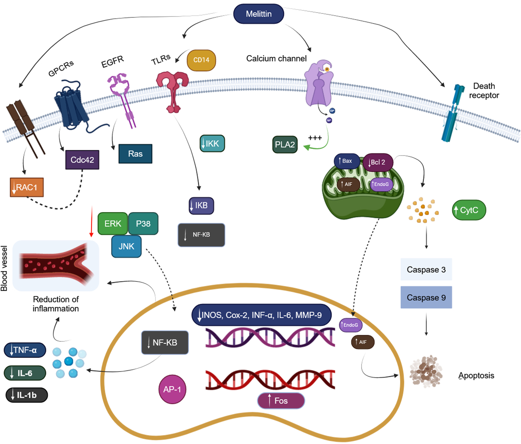 Mechanistic actions of bee venom melittin. (Generated by BioRender software).