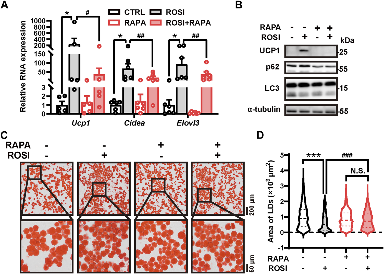 Figure 2. Rosiglitazone induces white adipocyte browning by inhibiting autophagy in oleic acid-treated adipocytes. (A–D) OA-induced whitened adipocytes were treated with rosiglitazone (ROSI, 10 μM) and rapamycin (RAPA, 5 nM) for 4 days. (A) Total RNA levels of Ucp1, Cidea, and Elovl3 were measured by qRT-PCR (n = 5–6 trials). (B) UCP1, p62, and LC3 protein levels were measured by Western blotting. α-Tubulin was blotted as a loading control. (C) Lipid droplets in adipocytes were marked by Oil Red O staining (n = 3 trials). The square box shows the zoomed-in view of the indicated image. Upper scale bar, 200 μm; lower scale bar, 50 μm. (D) Quantification of lipid droplets’ size from Oil Red O staining shown in (C). (n = 600–1,000 lipid droplets per group) Data in (A) and (D) are shown as mean ± SEM. Statistical analysis was performed by one-way ANOVA and nonparametric test with Dunn’s multiple comparisons. *p < 0.05, ***p < 0.001 versus CTRL. #p < 0.05, ##p < 0.01, and ###p < 0.001 versus ROSI.