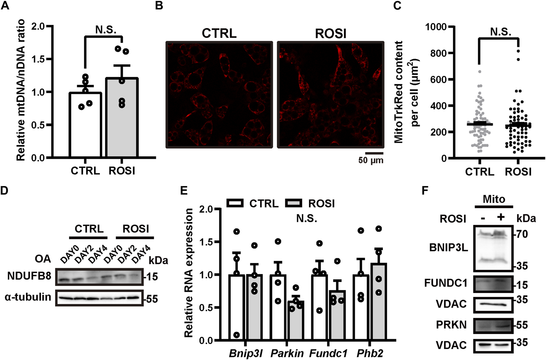 Rosiglitazone could not inhibit mitophagy in oleic acid-treated whitened adipocytes. (A–F) OA-induced whitened adipocytes were treated with rosiglitazone (ROSI, 10 μM) for 4 days. (A) Relative expressions of mitochondrial DNA (mtDNA) to nuclear DNA (nDNA) were measured by qRT-PCR (n = 5 trials). (B) Representative live image of MitoTracker Red staining in control or ROSI-treated adipocytes. Scale bar, 50 μm. (C) Quantification of MitoTracker Red fluorescence area showed in (B). (n = 60–80 cells per group) (D) NDUFB8 protein levels were measured by Western blotting. α-Tubulin was blotted as a loading control. (E) Total RNA levels of Bnip3l, Parkin, Fundc1, and Phb2 were measured by qRT-PCR (n = 4 trials). (F) BNIP3L, PRKN, and FUNDC1 protein levels in isolated mitochondria were measured by Western blotting. VDAC was blotted as a loading control. Data in (A,C, E) were shown as mean ± SEM. Statistical analysis by t-test shown in (A) and (E) and the Mann–Whitney test in (C).