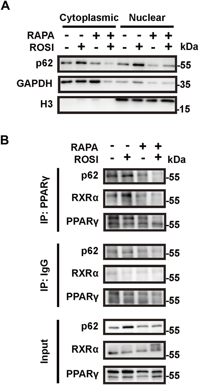 Figure 4. Rosiglitazone promotes nuclear translocation of p62 and stabilizes the PPARγ-RXRα heterodimer through autophagy inhibition. (A,B) OA-induced whitened adipocytes were treated with rosiglitazone (ROSI, 10 μM) and rapamycin (RAPA, 5 nM) for 4 days. (A) p62 protein levels in cytoplasmic and nuclear proteins of cultured adipocytes were measured by Western blotting. GAPDH was blotted as a loading control of the cytoplasmic protein, and H3 was blotted as a loading control of the nuclear protein. (B) Protein–protein interactions of p62, PPARγ, and RXRα in the nucleus were confirmed by immunoprecipitation.