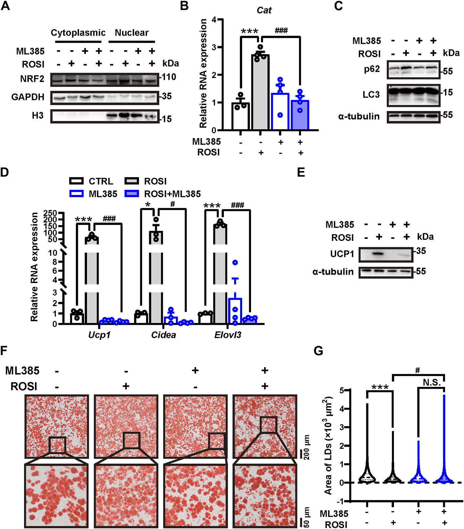 Rosiglitazone inhibits autophagy and promotes adipocyte browning through NRF2 activation (A–G) OA-induced whitened adipocytes were treated with rosiglitazone (ROSI, 10 μM) and ML385 (10 μM) for 4 days. (A) NRF2 protein levels in cytoplasmic and nuclear proteins of cultured adipocytes were measured by Western blotting. GAPDH was blotted as a loading control of cytoplasmic proteins, and H3 was blotted as a loading control of nuclear proteins. (B) Total RNA levels of Cat were measured by qRT-PCR (n = 3–4 trials). (C) p62 and LC3 protein levels were measured by Western blotting. α-Tubulin was blotted as a loading control. (D) Total RNA levels of Ucp1, Cidea, and Elovl3 were measured by qRT-PCR (n = 3–4 trials). (E) UCP1 protein levels were measured by Western blotting. α-Tubulin was blotted as a loading control. (F) Lipid droplets in adipocytes were marked by Oil Red O staining (n = 3 trials). The square box shows the zoomed-in view of the indicated image. Upper scale bar, 200 μm; lower scale bar, 50 μm. (G) Quantification of lipid droplets’ size from Oil Red O staining shown in (F). (n = 1,800–3,000 lipid droplets per group) Data in (B,D, G) are shown as mean ± SEM. Statistical analysis was performed by one-way ANOVA and nonparametric test with Tukey’s multiple comparisons in (B) and (D) and Dunn’s multiple comparisons in (G). *p < 0.05; ***p < 0.001 versus CTRL. #p < 0.05; ###p < 0.001 versus ROSI.