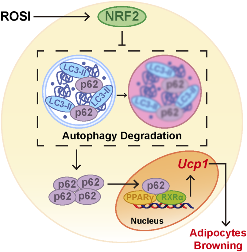 Results: In this study, we reported that rosiglitazone promoted adipocyte browning and inhibited autophagy. Rapamycin, an autophagy inducer, reversed adipocyte browning induced by rosiglitazone. Autophagy inhibition by rosiglitazone does not prevent mitochondrial clearance, which was considered to promote adipose whitening. Instead, autophagy inhibition increased p62 nuclear translocation and stabilized the PPARγ–RXRα heterodimer, which is an essential transcription factor for adipocyte browning. We found that rosiglitazone activated NRF2 in mature adipocytes. Inhibition of NRF2 by ML385 reversed autophagy inhibition and the pro-browning effect of rosiglitazone.