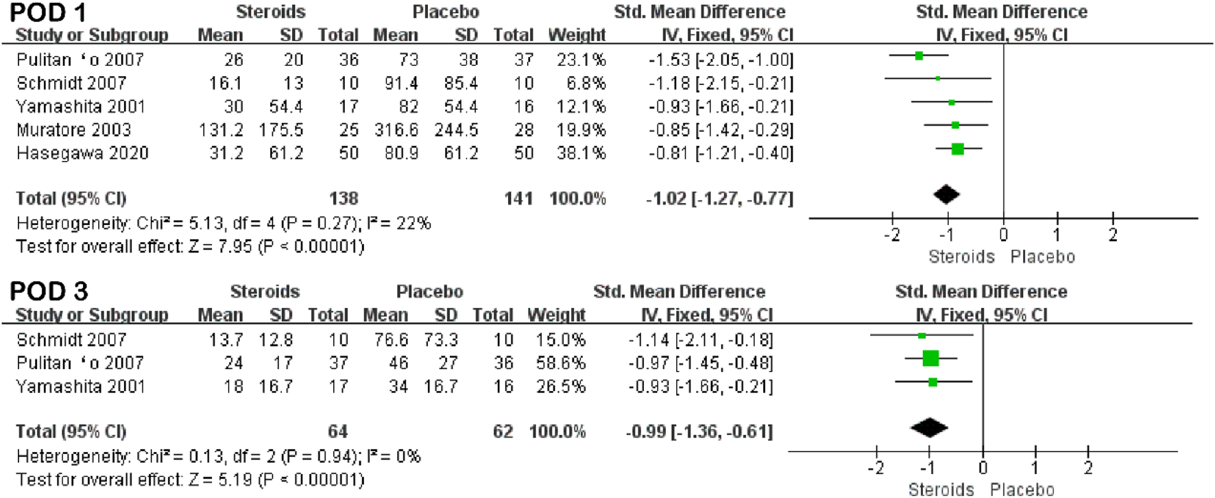 The interleukin-6 index was reported in five studies (Yamashita et al., 2001; Muratore et al., 2003; Pulitanò et al., 2007; Schmidt et al., 2007; Hasegawa et al., 2020) and three studies (Yamashita et al., 2001; Pulitanò et al., 2007; Schmidt et al., 2007) on PODs 1 and 3, respectively. Due to the low heterogeneity (I2 = 22% and I2 = 0%), the fixed-effects model was used for the pooled analysis. The results of the meta-analysis indicated that the IL-6 level in the steroid group was significantly lower than that in the placebo group on PODs 1 and 3 (SMD = −1.02; 95% CI: −1.27 to −0.77; and p < 0.001 and SMD = −0.99; 95% CI: −1.36 to −0.61; and p < 0.001) (Figure 4; Table 3).