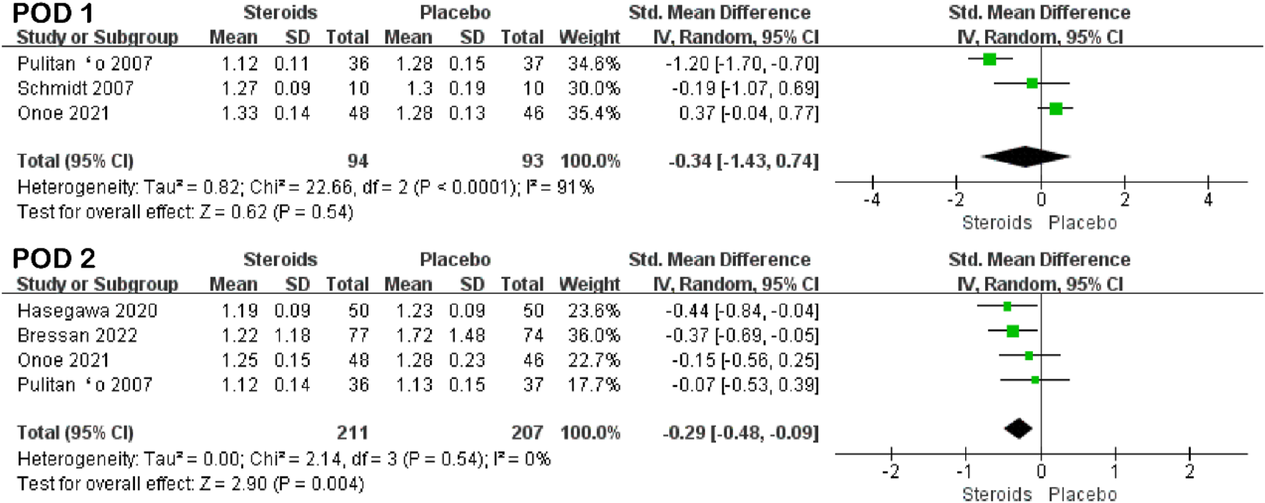 Prothrombin time was mentioned in three studies (Pulitanò et al., 2007; Schmidt et al., 2007; Onoe et al., 2021) and four studies (Pulitanò et al., 2007; Hasegawa et al., 2020; Onoe et al., 2021; Bressan et al., 2022) on PODs 1 and 2, respectively. The results of the meta-analysis showed that there was no significant difference in prothrombin time between the steroid and placebo groups on POD 1 (SMD = −0.34; 95% CI: −1.43 to 0.74; and p = 0.54) (Figure 6; Table 3), but the prothrombin time of the steroid group was significantly lower than that of the placebo group on POD 2 (SMD = −0.29; 95% CI: −0.48 to −0.09; and p = 0.004) (Figure 5; Table 3).