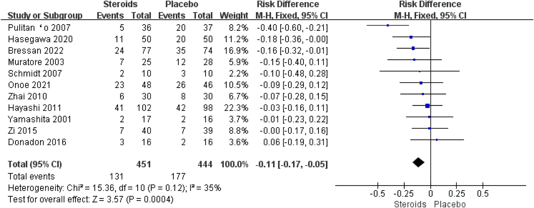 All 11 studies (Yamashita et al., 2001; Muratore et al., 2003; Pulitanò et al., 2007; Schmidt et al., 2007; Zhai et al., 2010; Hayashi et al., 2011; Zi et al., 2015; Donadon et al., 2016; Hasegawa et al., 2020; Onoe et al., 2021; Bressan et al., 2022) described the overall postoperative complications. Due to the high heterogeneity (I2 = 35%), the fixed-effects model was used for the pooled analysis. The meta-analysis showed that the overall complications after hepatectomy in the steroid group were significantly lower than those in the placebo group (OR = −0.11; 95% CI: −0.17 to −0.05; and p < 0.001) (Figure 7).