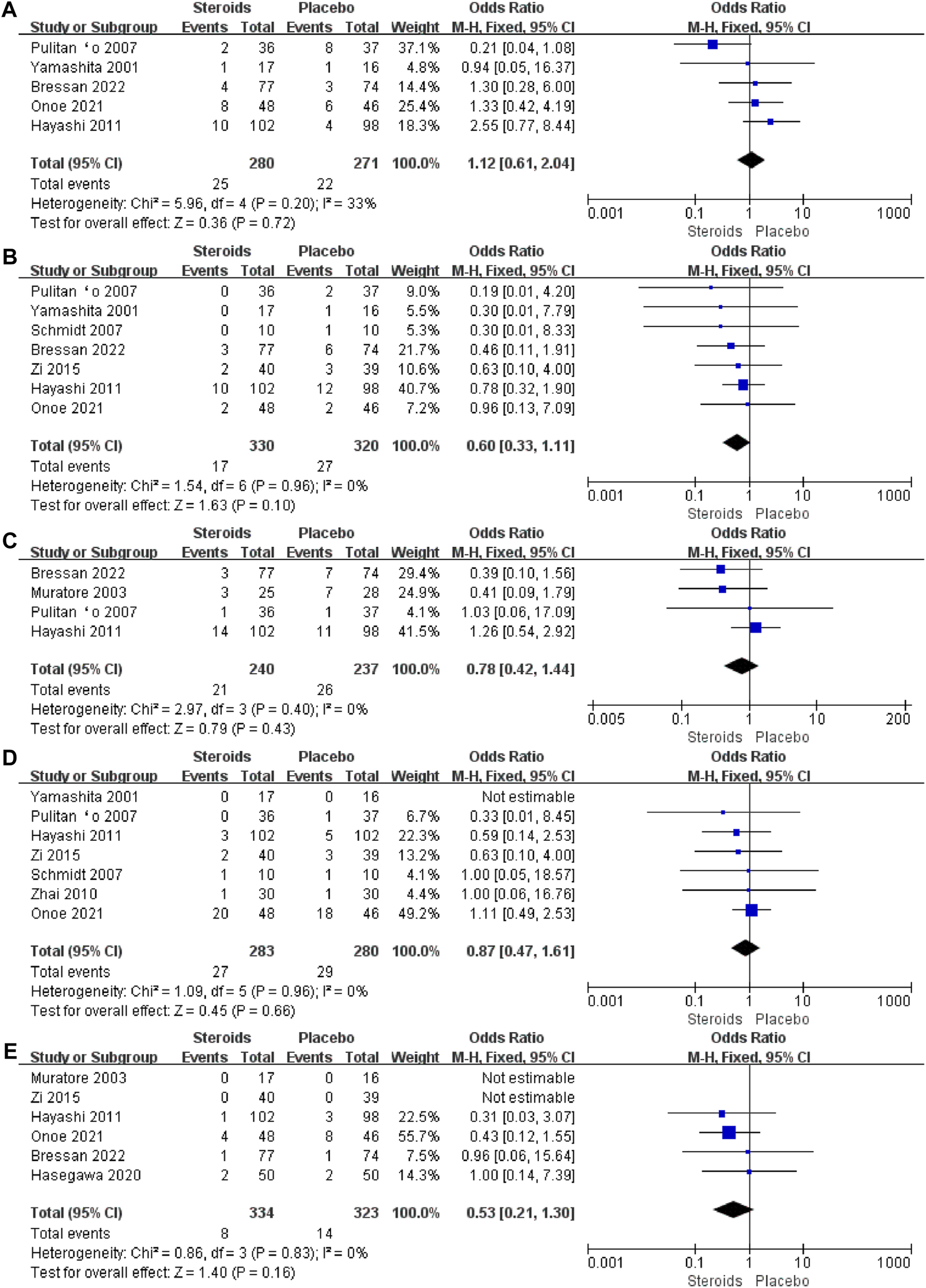 Steroid hormones can regulate gene expression to provide negative feedback for immune regulation (Scheinman et al., 1995) and inhibit lysosomal peroxidation to preserve cell membrane integrity (Serafín et al., 2004; Whitehouse, 2011), thereby stimulating the anti-inflammatory response of the body. Steroid hormones have been shown to reduce ischemia–reperfusion injury and the release of inflammatory cytokines (Hayashi et al., 2011). However, their use carries considerable risks, such as delayed wound healing, increased hyperglycemia postoperative infection risk, and reactivation of hepatitis viruses (Polderman et al., 2019). These side effects are particularly noteworthy in liver surgery; thus, it remains uncertain whether reducing the stress response translates into reduced perioperative complications. Although relevant meta-analyses have addressed this topic (Li et al., 2015; Yang et al., 2019), with new evidence being published (Onoe et al., 2021; Bressan et al., 2022), it becomes necessary to include the latest research findings for a comprehensive meta-analysis. Therefore, we conducted this meta-analysis to reassess the clinical value associated with perioperative steroid hormone usage in patients undergoing hepatectomy.