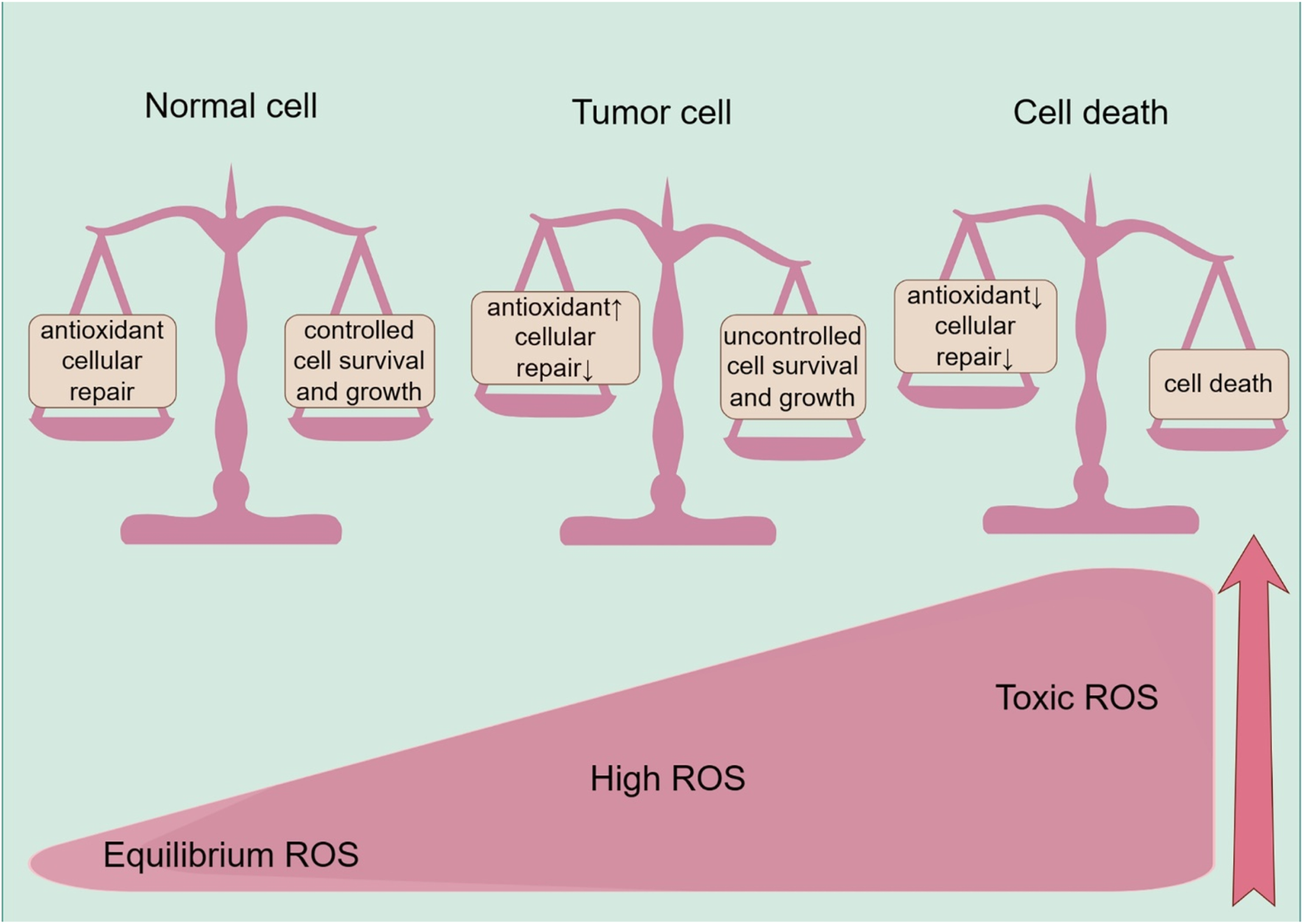 ROS effects on cells, including the normal cells, tumor progression, and cell death. Healthy cells have a well-balanced production of ROS, adequate antioxidant activity, and cellular repair, resulting in appropriate concentrations of ROS that limit cell survival and proliferation. Increased levels of ROS can cause cellular damage, yet tumor cells express the enhanced antioxidant activity and maintain pro-tumor signaling through adequate adaptation to conditions including hypoxia and through metabolic readjustment. However, ROS levels increase to toxic concentrations, and oxidative stress leads to irreparable damage to cells, inadequate adaptation, and, ultimately, tumor cell death.
