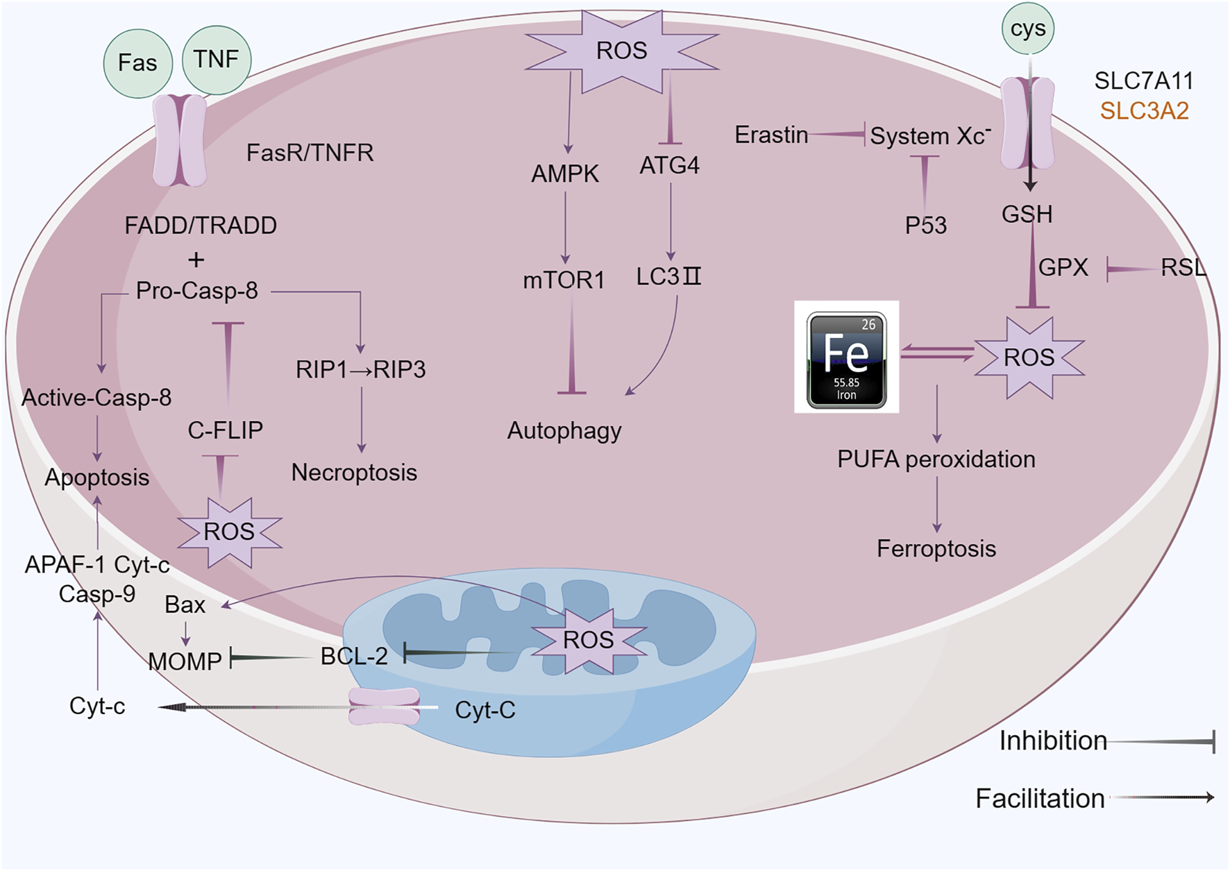When ROS accumulation exceeds a certain threshold, these molecules shift their functional role from promoting carcinogenic processes such as cell proliferation and invasion to exerting anticancer effects by triggering regulated cell death (RCD) pathways. Such as apoptosis, autophagy, ferroptosis, necroptosis, and Oxeiptosis (Hengartner, 2000).