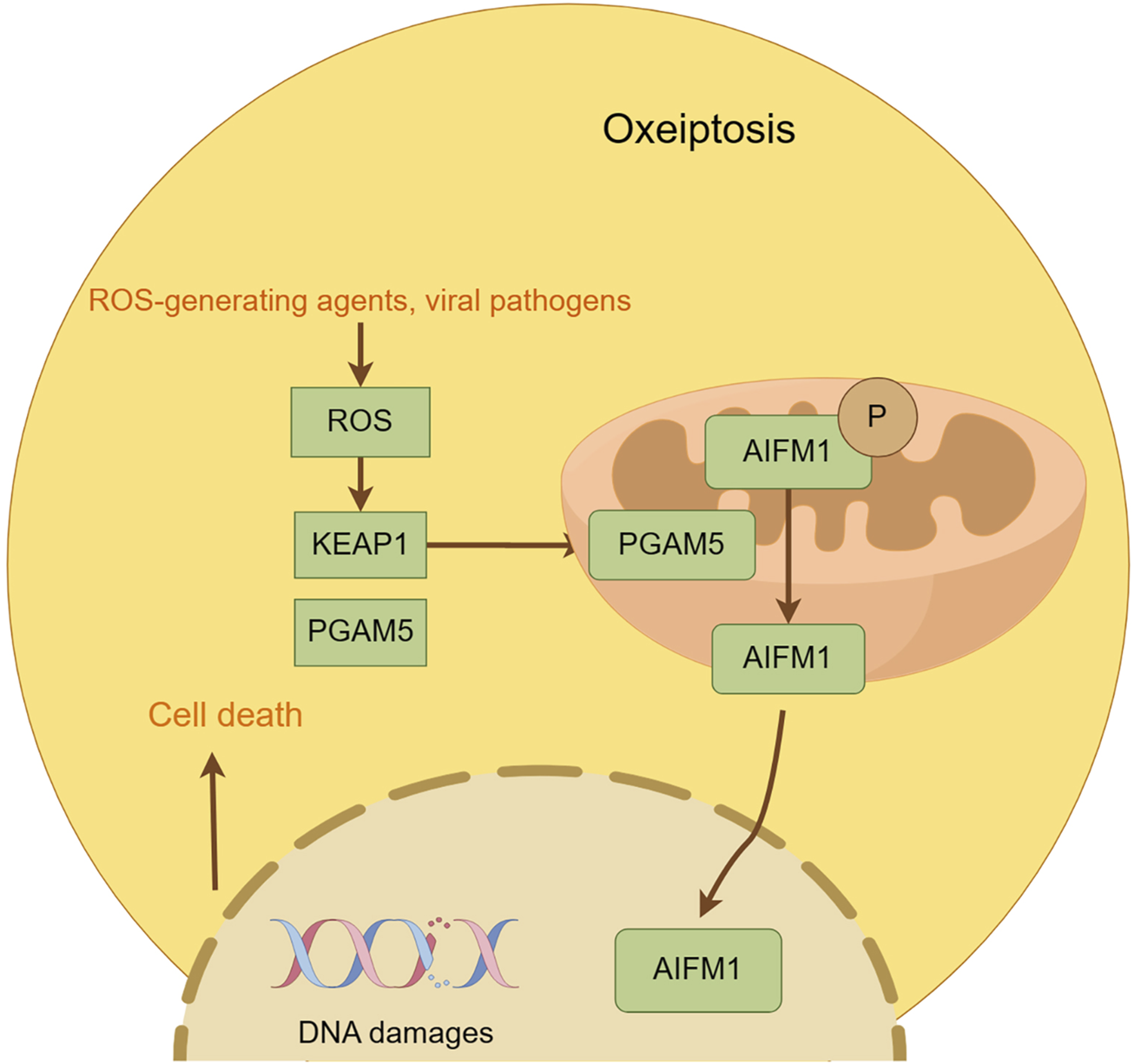 This figure illustrates the key features of oxeiptosis. Oxeiptosis is activated in response to oxidative stress induced by ROS or ROS-generating agents, such as viral pathogens. The KEAP1/PGAM5/AIFM1 signaling pathway plays a central role in oxeiptosis, in which AIFM1 is dephosphorylated under oxidative stress conditions via the regulatory action of PGAM5. Dephosphorylated AIFM1 is translocated from mitochon-dria to the nucleus, leading to chromatin condensation and DNA fragmentation, ultimately resulting in cell death.