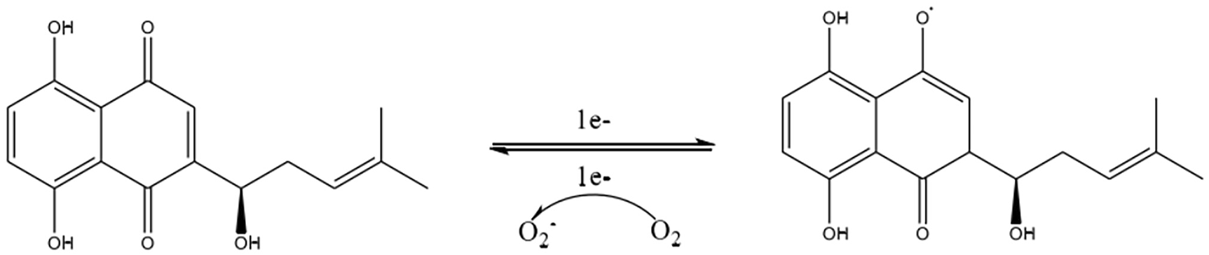 Shikonin, a complex compound that is rich in a diversity of chemical metabolites such as naphthoquinones, flavonoids, phenolic acids, terpenoids, and polysaccharides, possesses notable antitumorigenic properties. These properties are primarily associated with the unique structural characteristics of its α-1,4 naphthoquinone parent moiety (Figure 6). The naphthoquinone framework possesses the capacity to produce ROS, which in turn modulate cellular oxidative stress levels (Adjobo-Hermans et al., 2020). The mechanism by which this occurs is detailed (Figure 7). It involves the semiquinone residue of the naphthoquinone ring undergoing a uniprotocol electron transfer reduction reaction, followed by re-oxidation to the quinone state in the presence of oxygen molecules. This redox shuttle activity results in the production of substantial quantities of ROS. The elevated levels of ROS can then inflict damage on cellular proteins, lipids, and DNA, which consequently impacts the membrane potentials of both the cellular and mitochondrial compartments (Chen et al., 2002; Kumar et al., 2021; Yadav et al., 2022; Zhao M. et al., 2023). Accordingly, the oxidative-reductive capabilities of the naphthoquinone ring are utilized, with an emphasis on the anticancer impacts of shikonin mediated by the production of high levels of ROS.