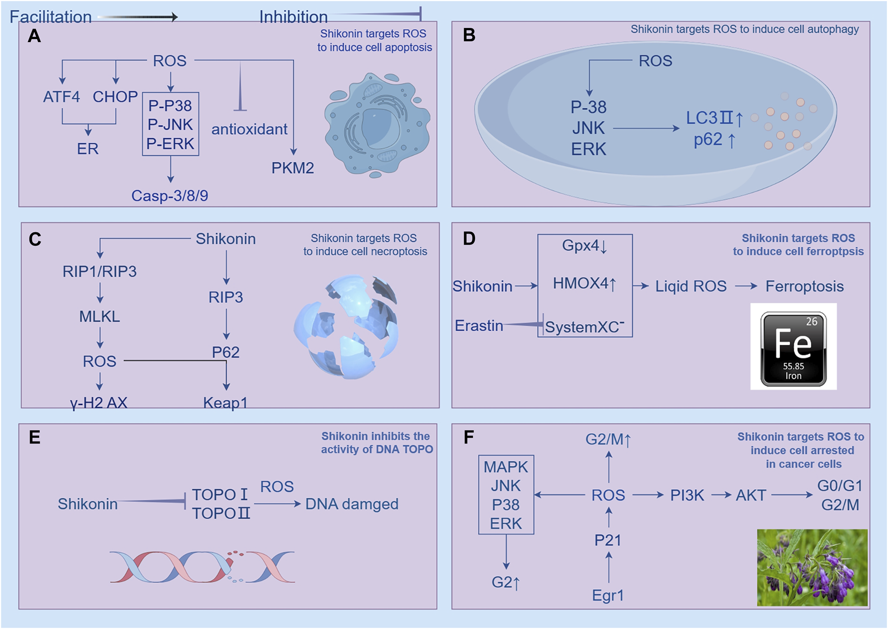 Shikonin has been shown to regulate ROS (reactive oxygen species) to induce cell death in cancer cells, which encompasses apoptosis, autophagy, necroptosis, ferroptosis, inhibition of topoisomerase activity, and cell cycle arrest. (A) illustrates how shikonin regulates ROS-induced apoptosis in cancer cells through mitochondrial-related, ER (endoplasmic reticulum)-targeted, and energy metabolism pathways. Shikonin promotes tumor cell apoptosis by increasing ROS production. Ginsenosides activate caspase 9/3 pathways and mitochondria-mediated apoptosis pathways in a ROS-dependent manner, and also induce mitochondria-dependent apoptosis by upregulating the ROS-mediated PTEN/PI3K/Akt/mTOR signaling pathway. Increased ROS also stimulates the upregulation of ATF4 (activating transcription factor 4) and CHOP (C/EBP homologous protein), interfering with glycolysis pathways. Reduction of ROS induced by shikonin also mediates apoptosis, with the upregulation of ROS-induced c-Jun N-terminal kinase (JNK) activity mediating mitochondrial apoptosis pathways, while inhibiting antioxidant enzyme activity also suppresses mitogen-activated extracellular signal-regulated kinase (MEK) and mitogen-activated protein kinase (MAPK). (B) shows that shikonin triggers autophagy in various cancer cell lines by increasing intracellular ROS levels, activating ERK and JNK signaling pathways, regulating the expression of LC3 and p62, and promoting the expression of autophagy-related proteins. (C) indicates that shikonin can coordinate cell necroptosis and autophagy flux disruption by modulating the RIP3/p62/Keap1 complex, enhancing cell necroptosis. (D) illustrates how shikonin downregulates GPX4 and upregulates heme oxygenase 1 (HMOX1), and Erastin increases lipid reactive oxygen species by inhibiting System Xc- to induce ferroptosis. (E) demonstrates how shikonin and its derivatives act as inhibitors of topoisomerase I (TOPO I), inducing RIP1/RIP3 activation and increasing intracellular ROS to induce DNA double-strand breaks. (F) illustrates how shikonin arrests the cell cycle at different stages, inducing cell death. Shikonin causes cell cycle arrest at G0/G1 or G2/M by reducing the expression of PI3K, p-PI3K, Akt, p-Akt, and m-TOR. It also inhibits cell proliferation by activating the Egr1-mediated p21 signaling pathway, leading to G2/M cell cycle arrest.
