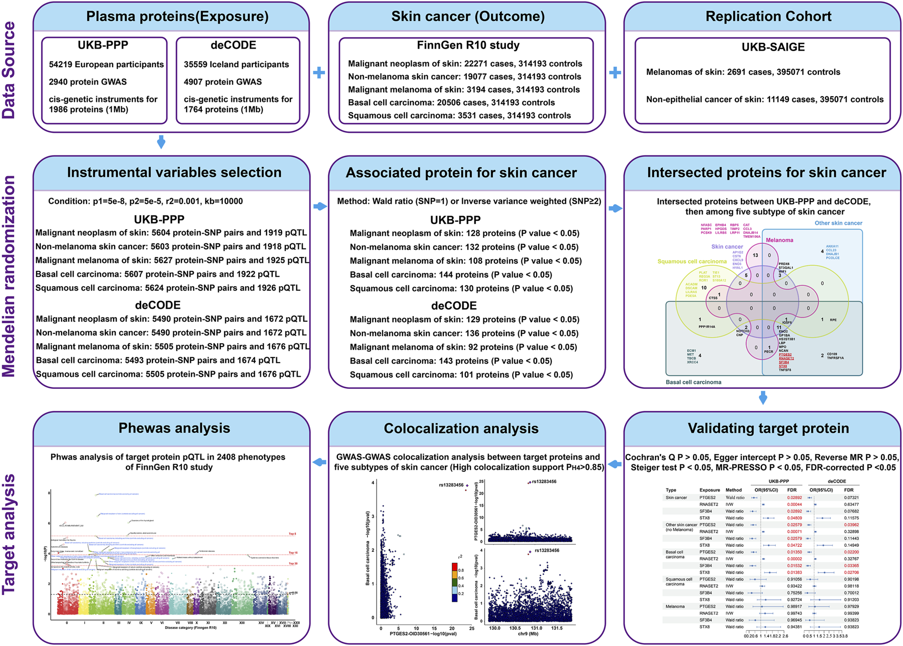 Proteome-wide mendelian randomization was performed using inverse-variance-weight and Wald Ratio methods, leveraging 1 Mb cis protein quantitative trait loci (cis-pQTLs) in the UK Biobank Pharma Proteomics Project (UKB-PPP) and the deCODE Health Study, to determine the causal relationship between plasma proteins and skin cancer and its subtypes in the FinnGen R10 study and the SAIGE database of Lee lab. Significant association with skin cancer and its subtypes was defined as a false discovery rate (FDR) < 0.05. pQTL to GWAS colocalization analysis was executed using a Bayesian model to evaluate five exclusive hypotheses. Strong colocalization evidence was defined as a posterior probability for shared causal variants (PP.H4) of ≥0.85. Mendelian randomization-Phenome-wide association studies (MR-PheWAS) were used to evaluate potential biomarkers and therapeutic targets for skin cancer and its subtypes within a phenome-wide human disease category.