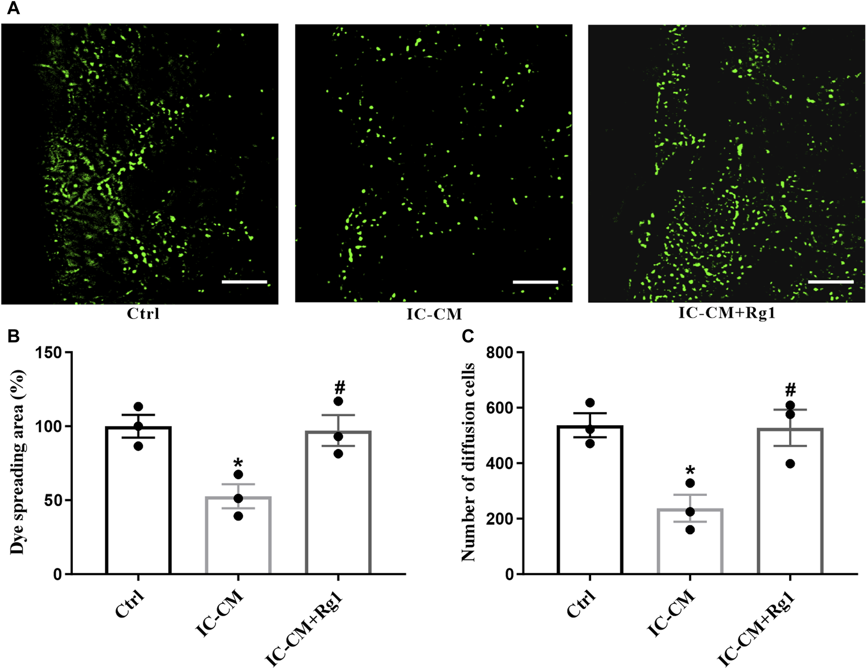 Rg1 ameliorates inflammation-induced gap junctional dysfunction in glial cells. The SLDT assay was conducted to detect the influence of Rg1 or inflammatory cytokines on gap junction intercellular communication (A), which was indicated by the dye spreading area (B) and number of diffusion cells (C). Scale bar = 100 μm. n = 3. *p < 0.05, compared with the Ctrl group; #p < 0.05, compared with the IC-CM group. SLDT, scrape-loading and dye transfer; IC-CM, inflammatory cytokines-conditioned medium.