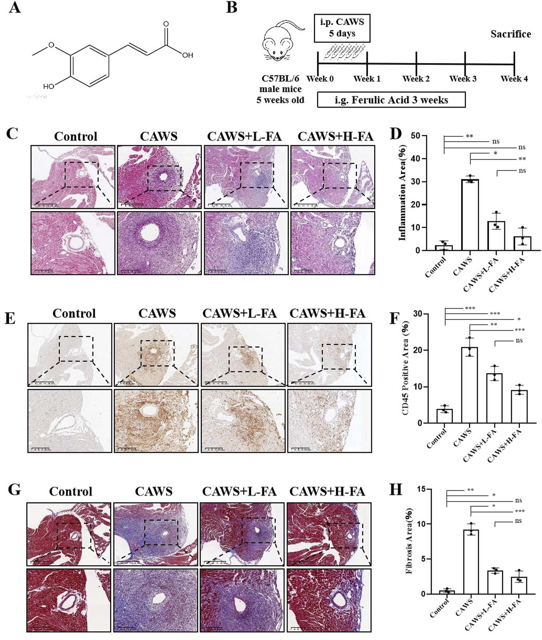 FA alleviated coronary artery inflammation in CAWS-induced KD mice. (A) The chemical structure of FA. (B) A flow diagram illustrating the experimental procedure for inducing Kawasaki disease (KD) in mice and treating them with FA. (C) HE staining of around mouse coronary artery in different groups. Scale bars 625 μm, 200 μm. (D) The quantification of HE staining in different groups (n = 3). (E) Immunohistochemistry of CD45 in different groups. Scale bars 625 μm, 200 μm. (F) The quantification of CD45 immunohistochemistry in different groups (n = 3). (G) Mason staining around mouse coronary artery in different groups. Scale bars 400, 200 μm. (H) The quantification of Mason staining in different groups (n = 3). Mean ± SD, *p < 0.05, **p < 0.01, ***p < 0.001 indicate significant differences, and ns > 0.05 means no significance difference.