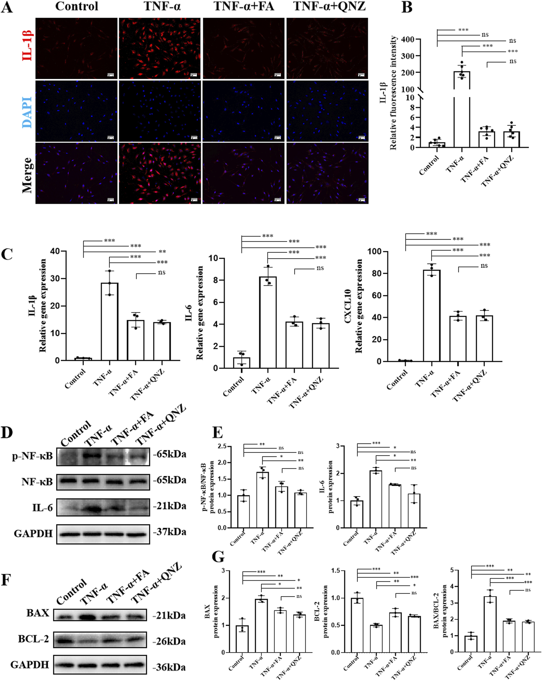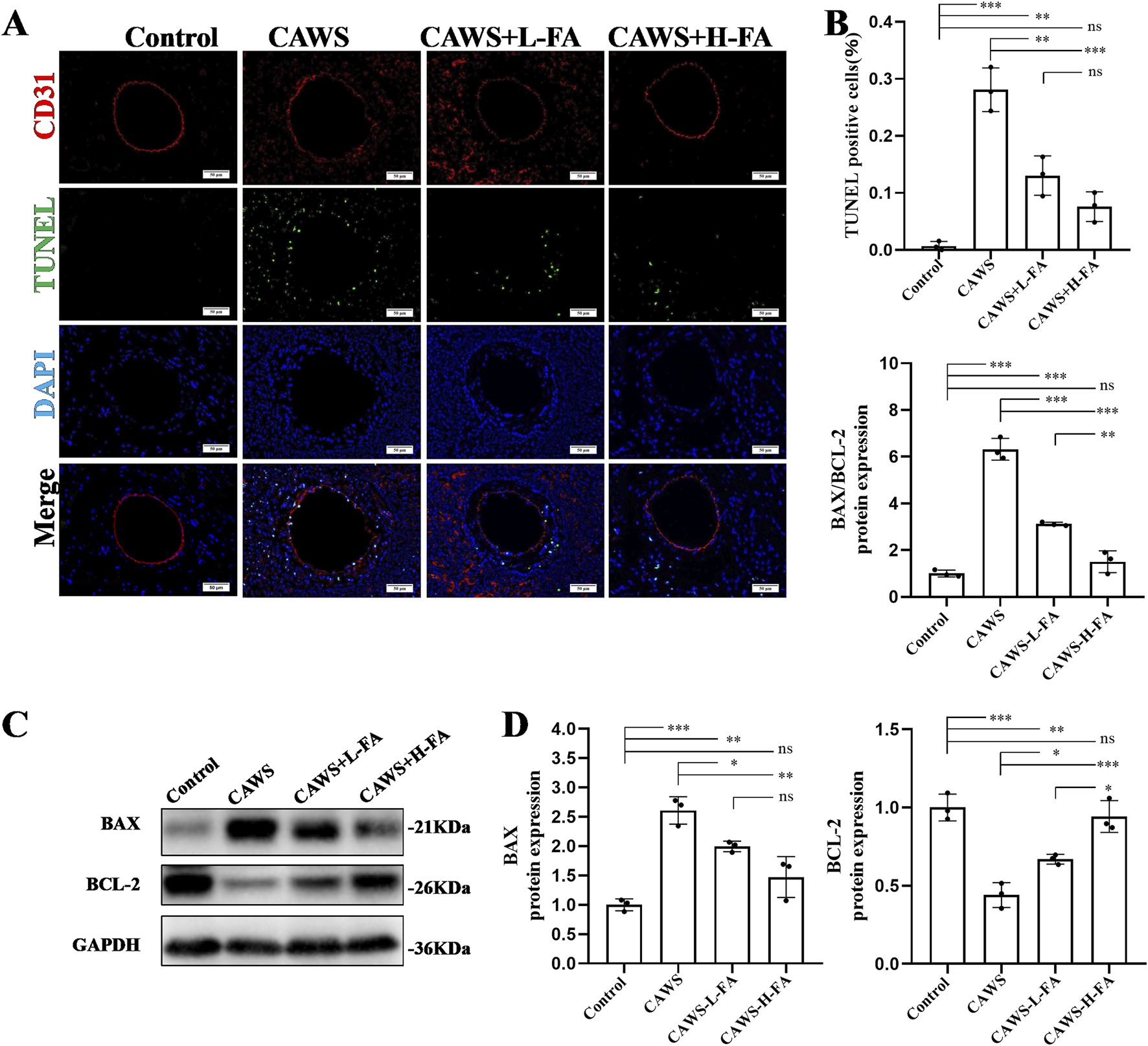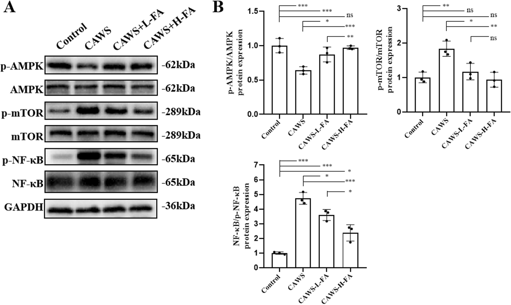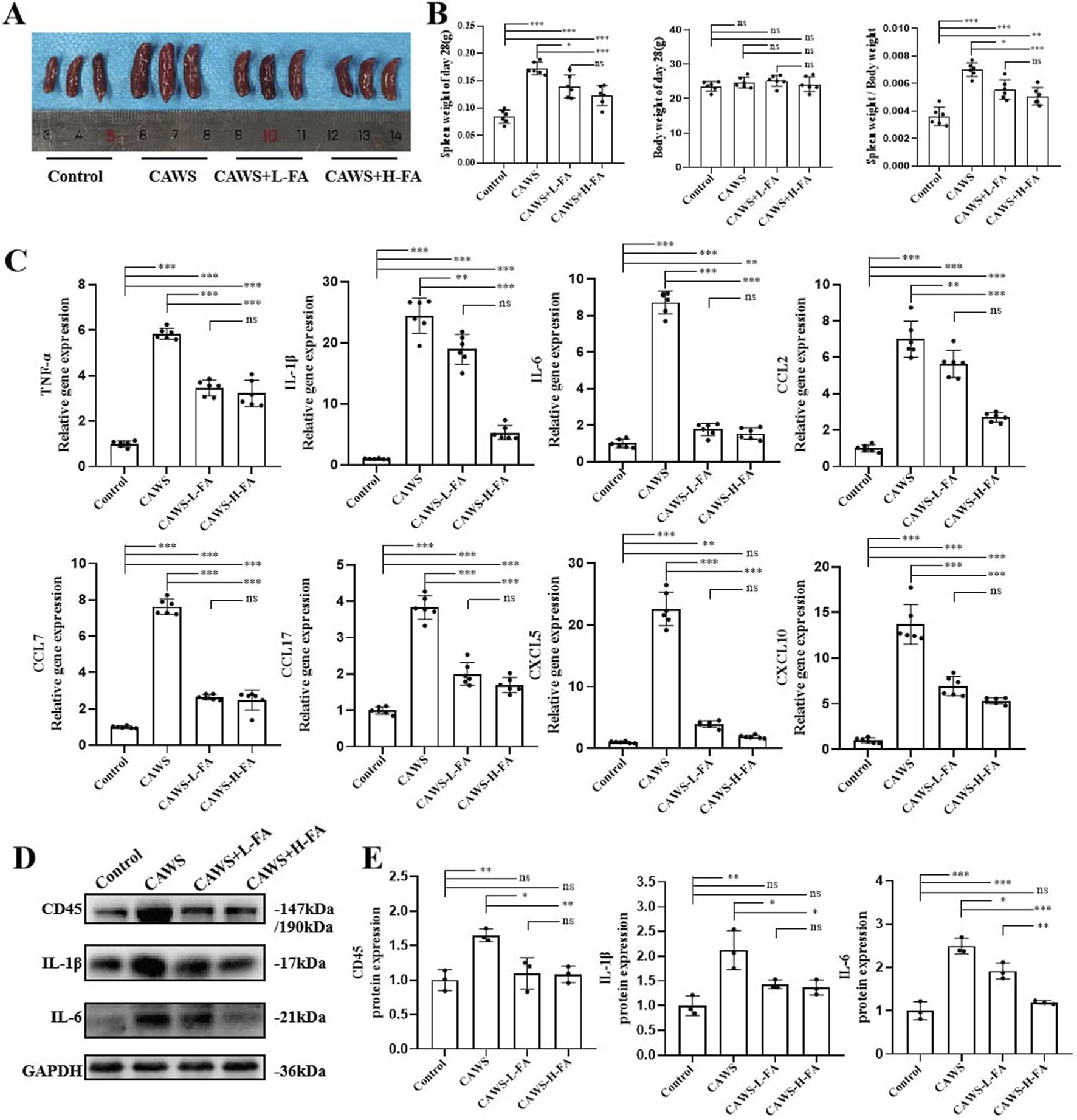 FA decreased inflammation in CAWS-induced KD mice. (A) The representative images of mouse spleens in different groups on day 28. (B) Spleen weight, body weight, and the ratio of spleen weight/body weight on day 28 in different groups (n = 3). (C) The mRNA expression levels of inflammatory cytokines and chemokines in the aortic root and proximal coronary artery regions of mouse heart tissues in each group were evaluated using RT-qPCR (n = 3). (D) Western blot analysis was employed to assess the expression of CD45, IL-1β, and IL-6 proteins in the aortic root and proximal coronary artery regions of mouse heart tissues in each group. (E) The quantification of western blot in different groups (n = 3). Mean ± SD, *p < 0.05, **p < 0.01, ***p < 0.001 indicate significant differences, and ns > 0.05 means no significance difference.