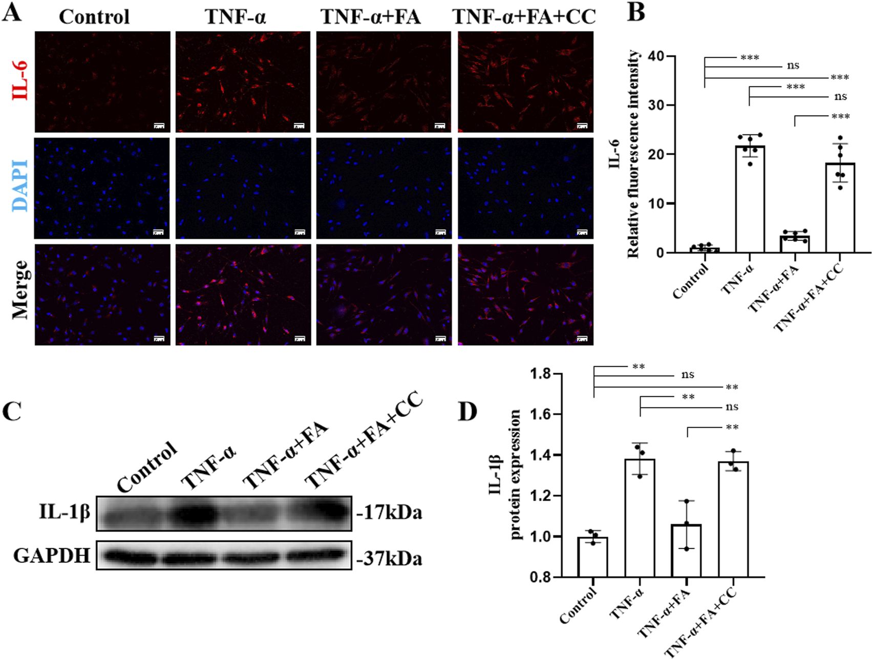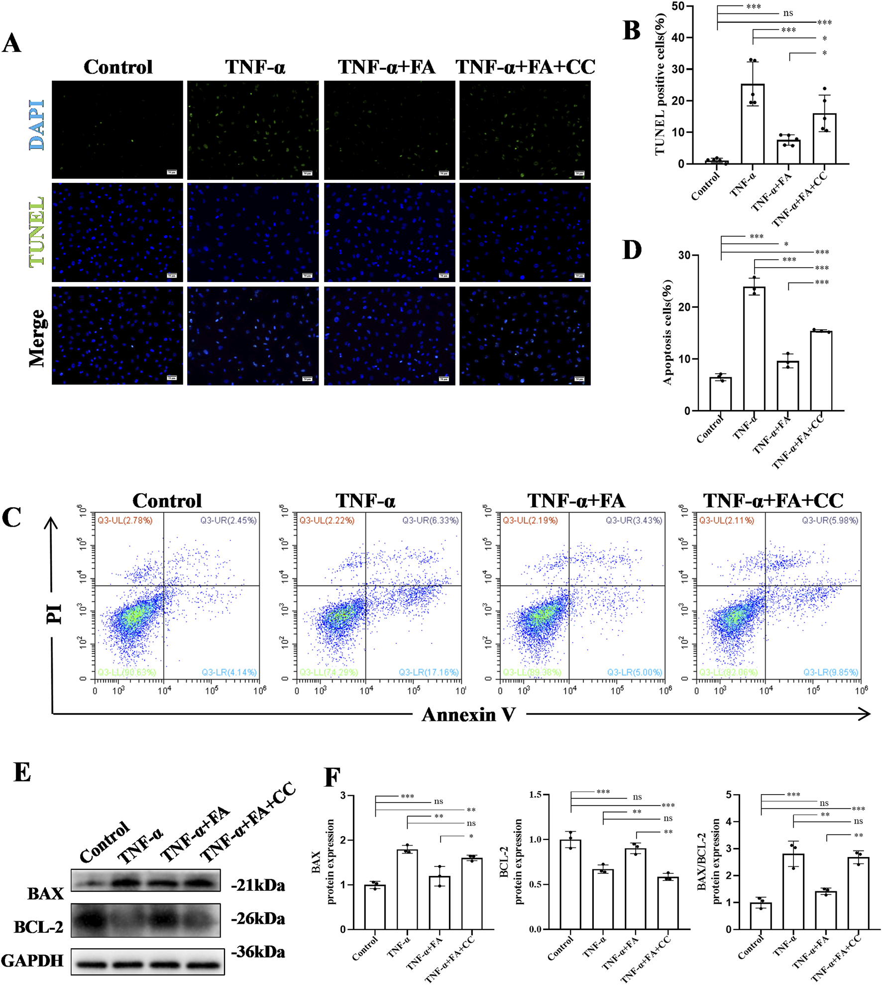 HUVECs (ATCC, VA, United States) were cultured in high-glucose DMEM medium with 10% fetal bovine serum (FBS, Gibco, NY, United States) and 1% penicillin/streptomycin (P/S) at a 37°C, 5% CO2 incubator, and the medium was refreshed every other day. TNF-α (PeproTech, NJ, United States) was used to induce HUVEC KD model, and the optimum working concentration of TNF-α was determined by CCK-8 experiments. HUVECs were divided into different treatment groups: control group, TNF-α group, TNF-α+FA group, and TNF-α + QNZ group. We also set another groups such as control group, TNF-α group, TNF-α + FA group, and TNF-α + FA + CC group. HUVECs were pre-treated with TNF-α (1 μg/mL) and then treated with FA (20 μM) or a mixture of FA (20 μM) and the p-NF-κB inhibitor QNZ (10 nM, Selleck, TN, United States) or FA (20 μM) and the AMPK inhibitor compound c (CC, 10 μM, MedChem Express Biotechnology, NJ, United States) for another 24 h. The working concentrations of QNZ and CC were based on a previous report (Jian et al., 2019; Wang et al., 2024).