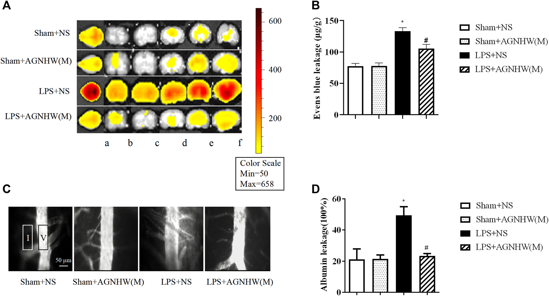The Effect of AGNHW on Evans Blue Extravasation in Mouse Brain Tissue and FITC-Dextran Leakage in the Microvasculature on the Surface of the Mouse Brain. (A) Small-animal PET images of EB extravasation in mouse brain tissue. (A) Whole brain; b–f: brain tissue slices. (B) Results of spectrophotometry analysis of EB extravasation in mouse brain tissue (N = 6); the error bars represent the means ± SEMs. *p < 0.05 vs. Sham + NS, #p < 0.05 vs. LPS + NS. (C) Representative images of FITC-dextran leakage in mouse brain surface microvessels. (D) Statistical analysis of FITC-dextran leakage in mouse brain surface microvessels (N = 6); the error bars represent the means ± SEMs. *p < 0.05 vs. Sham + NS, #p < 0.05 vs. LPS + NS.