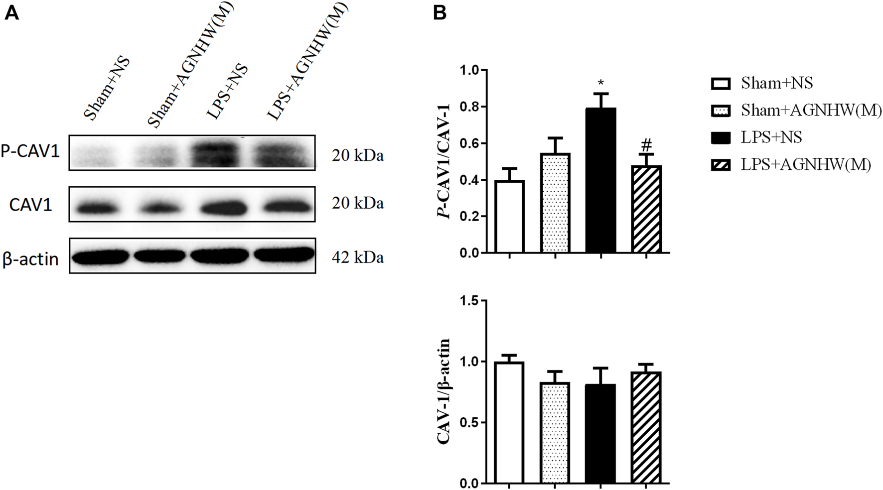The Effect of AGNHW on the Phosphorylation of CAV-1 in Mouse Brain Tissue (A) Western blot results showing the expression of CAV-1 and phosphorylation of CAV-1 in the mouse brain. (B) Statistical graph of the expression of CAV-1 and phosphorylation of CAV-1 in the mouse brain (N = 6). The error bars represent the means ± SEMs. *p < 0.05 vs. Sham + NS, #p < 0.05 vs. LPS + NS.