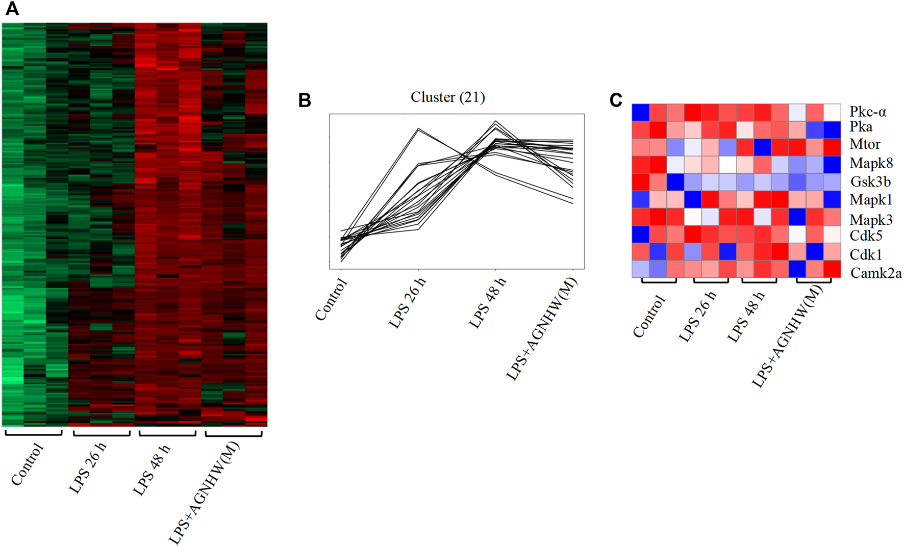 Differential Phosphoproteomic Analysis (A) Heatmap of the differential expression of phosphorylated proteins in mouse brain tissue; p < 0.05, fold change ≥1.5. (B) Line graph showing increased levels of phosphorylated proteins after LPS stimulation compared to 0 h and decreased levels of phosphorylated proteins after AGNHW treatment. (C) Heatmap of PTM-SEA kinase activity analysis results.