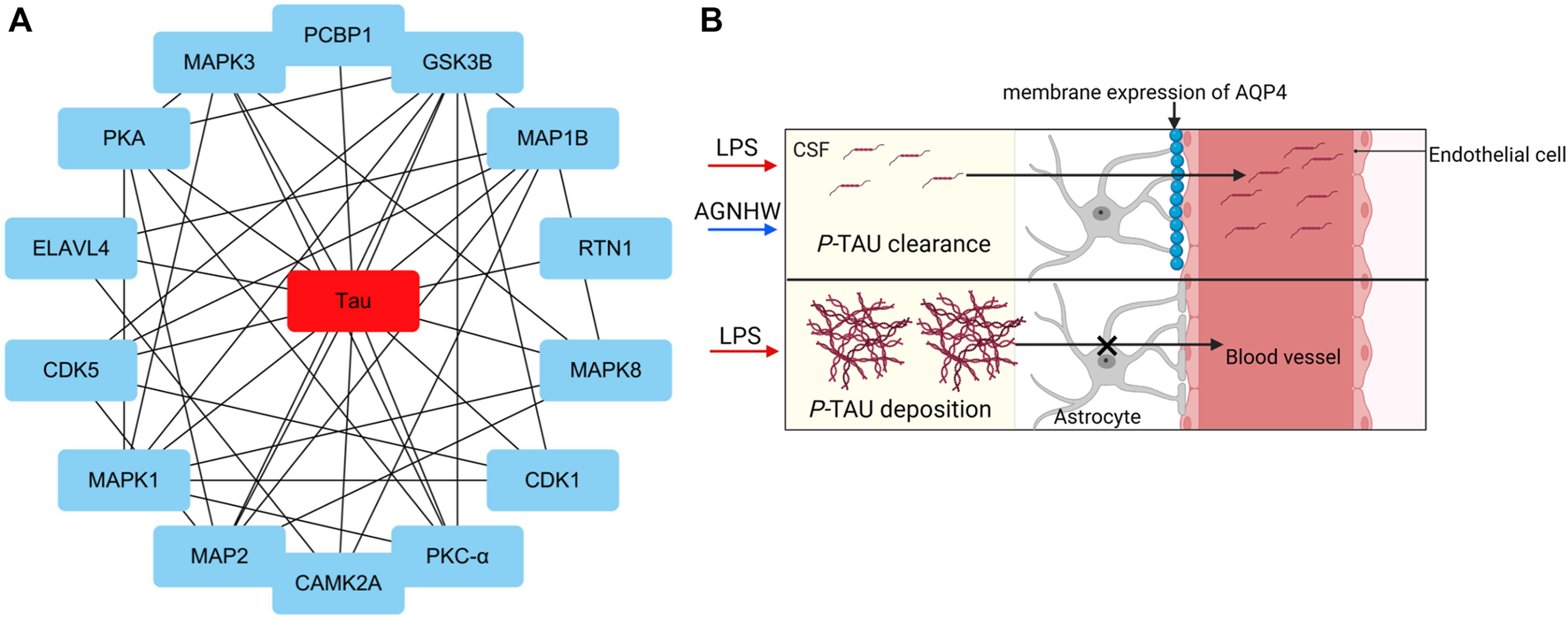 Core Proteins of the Phosphoprotein Interaction Network (A) Diagram of the core network of protein‒protein interactions, with P-Tau at the center. (B) Schematic representation of P-Tau as a marker for cerebral edema clearance, where P-Tau does not accumulate in brain tissue when AQP4 has normal edema clearance capabilities and accumulates when AQP4 has impaired edema clearance capabilities.