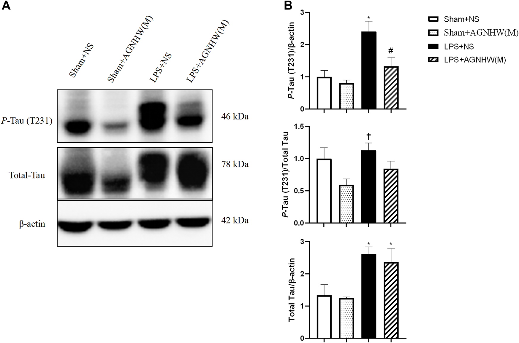 We used Western blotting to verify the effects of LPS stimulation and AGNHW administration on P-Tau. Figures 8A, B show the Western blot results for phosphorylated Tau protein (T231) and total Tau protein expression levels. Compared to the Sham + NS group, the LPS group exhibited increased expression of P-Tau in brain tissue, while AGNHW inhibited this increase. In terms of the regulation of Tau phosphorylation levels, Tau phosphorylation was not significantly increased in the LPS + NS group compared to that in the Sham + NS group. Similarly, AGNHW administration did not significantly inhibit the increase in Tau phosphorylation compared to that in the LPS + NS group. Compared to that in the Sham + AGNHW (M) group, the level of phosphorylated Tau was significantly greater in the LPS group. Finally, total Tau expression was significantly increased in the LPS + NS group compared to the Sham + NS group, and AGNHW administration did not reduce the expression of total Tau (Figures 8A, B).
