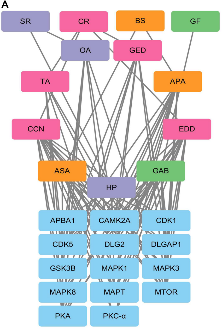 Regulatory Network between Differentially Phosphorylated Proteins and AGNHW Blood Metabolites (A) Protein‒protein interaction network between blood metabolites of AGNHW and differentially phosphorylated proteins according to phosphoproteome data. SR: Scutellariae Radix; CR: Curcumae Radix; BS: Borneolum Syntheticum; GF: Gardeniae Fructus.