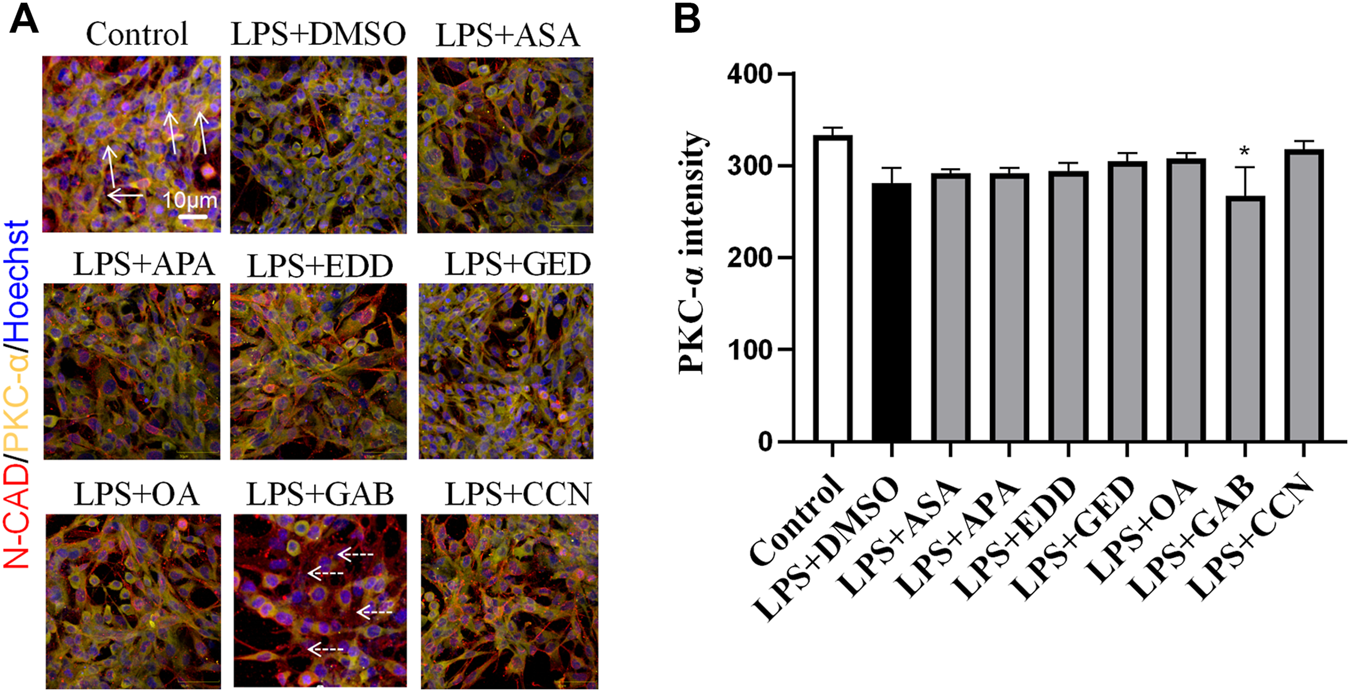 To explore the effects of AGNHW blood metabolites on LPS-induced AQP4 and PKC-α expression in astrocyte, we applied LPS (1 μg/mL) to a blood‒brain barrier cell model at 0 and 24 h. At the 26th hour, seven AGNHW blood metabolites were added separately to the culture medium at 10−5 mol/L. Immunofluorescence staining was performed 48 h later, and the average fluorescence intensity of AQP4 at single-pixel points of N-Cadherin (N-CAD) was recorded using a microlens dual spinning disk confocal high-content system. AQP4 expression on the astrocyte membrane was significantly reduced in the LPS + DMSO group, significantly increased in the LPS + GAB group, and showed no significant differences in the LPS + ASA, LPS + APA, LPS + EDD, LPS + GED, LPS + OA, and LPS + CCN groups compared to that in the control group (Figures 11A, B). Additionally, The expression of PKC-ɑ was significantly reduced in the LPS + GAB group compared to the control group, while no significant differences were observed in the other groups (Figures 12A, B).