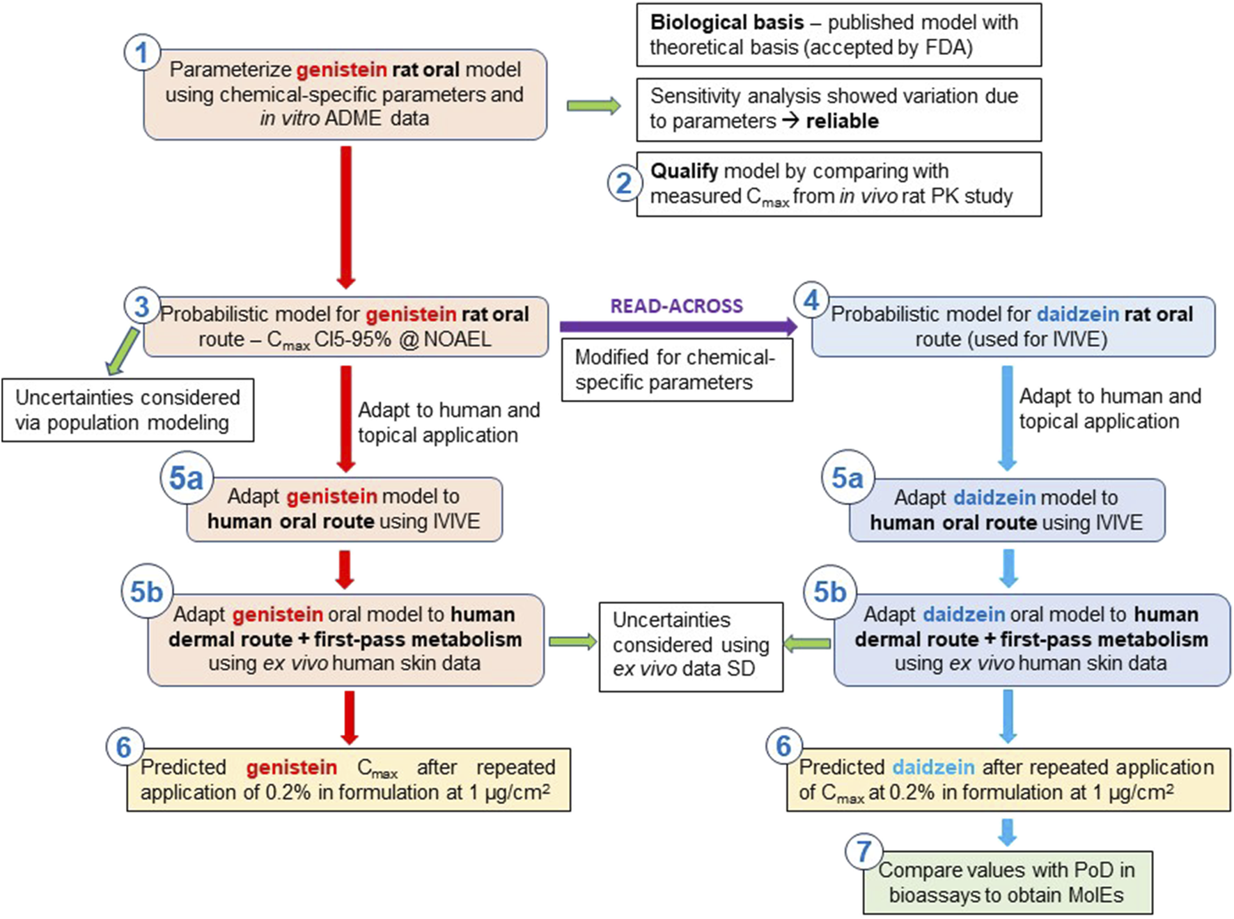 An oral rat PBPK model for genistein was built using PK-Sim® and in vitro ADME input data. This formed the basis of the daidzein oral rat PBPK model, for which chemical-specific input parameters were used. Rat PBPK models were then converted to human models using human-specific physiological parameters and human in vitro ADME data. In vitro skin metabolism and penetration data were used to build the dermal module to represent the major route of exposure to cosmetics.