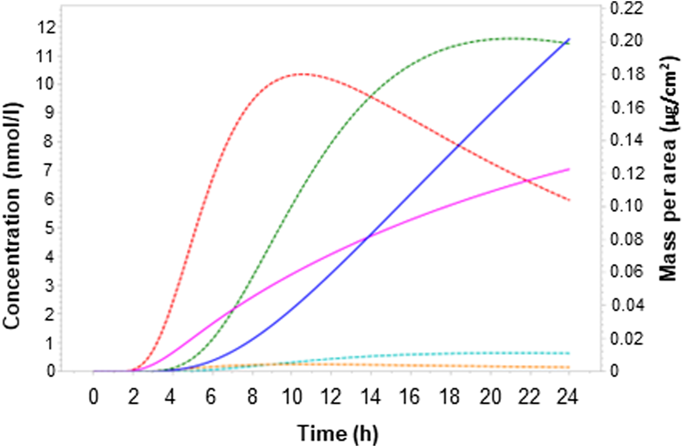 The oral route was not relevant for the human PBPK model, in which dermal exposure was the only route of exposure. Therefore, the human PBPK model was extended to include a dermal module for topical application, based on a skin permeation model published by Dancik et al. (2013). The skin model was built in MoBi (Bayer Technology Services, Leverkusen, Germany). The skin permeation model has several compartments: air, surface pool, vehicle, skin, and in vivo link compartment. The skin compartment is a one-dimensional multilayered slab into which an applied chemical passively diffuses. Each slab layer corresponds to a skin layer (stratum corneum, epidermis, and dermis) and derives its diffusion parameters from the layer’s physical and chemical properties. Dermal clearance in in vivo simulations of the chemical undergoes passive transport from all sub-layers of the skin layers into the bloodstream. The chemical diffusion through the skin sub-layers is numerically computed using the methods of finite differences and Fick´s law ((Fick, 1995) which models the one-dimensional diffusive flux over a spatial position, see Equation 1 below).