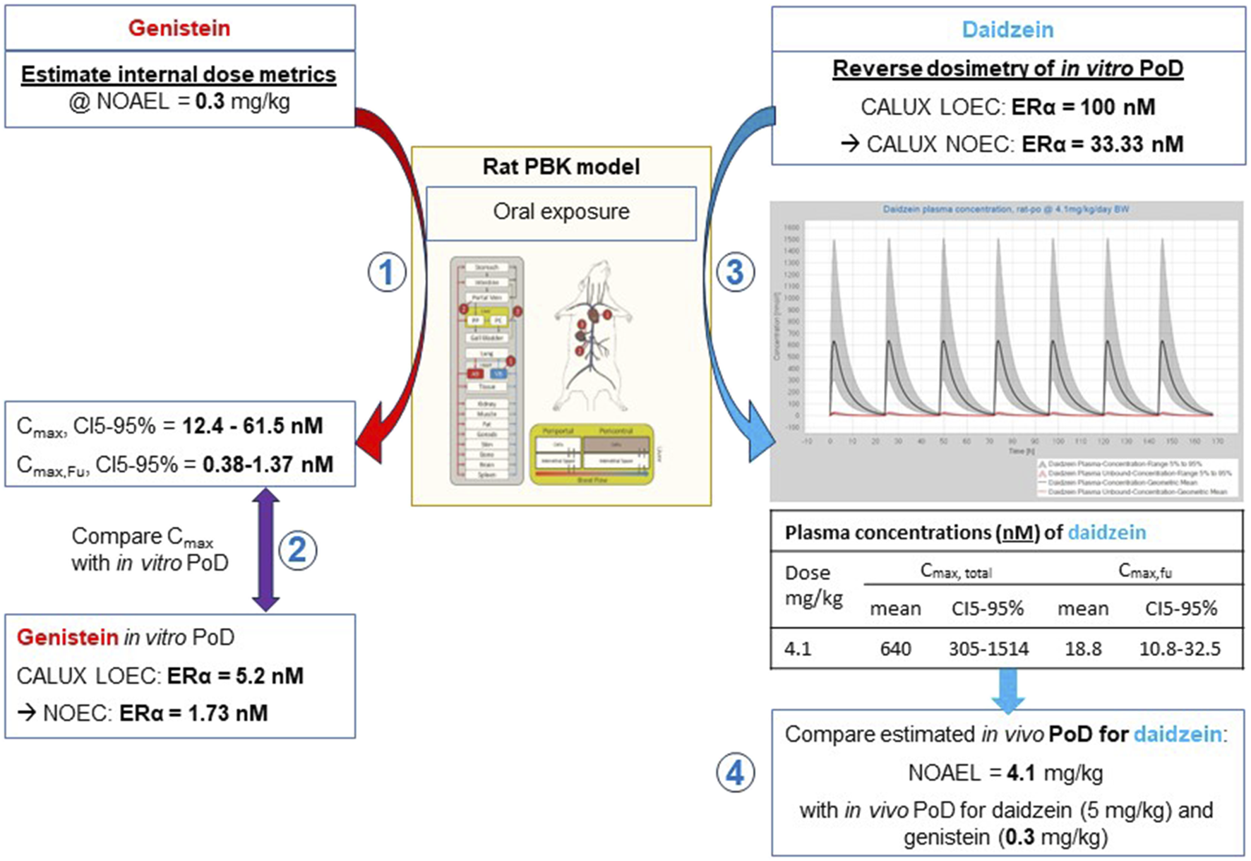 The initial oral rat model for genistein was qualified since it predicted values within 2-fold of measured in vivo PK values. This was used to predict plasma concentrations from the in vivo NOAEL for genistein to set test concentrations in bioassays. Intrinsic hepatic clearance and unbound fractions in plasma were identified as sensitive parameters impacting the predicted Cmax values. Sensitivity and uncertainty analyses indicated the developed PBPK models had a moderate level of confidence. An important aspect of the development of the dermal module was the implementation of first-pass metabolism, which was extensive for both chemicals. The final human PBPK model for daidzein was used to convert the in vitro PoD of 33 nM (from an estrogen receptor transactivation assay) to an external dose of 0.2% in a body lotion formulation.