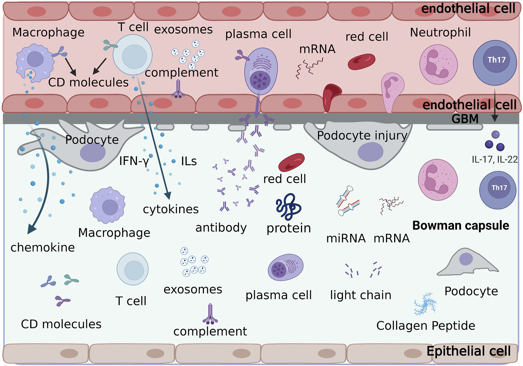 The formation process and types of urine biomarkers. Various cells, cytokines, adhesion molecules, antibodies, light chain fragments, soluble leukocyte markers, proteins and small molecule peptides, metabolomics, exosomes, and ribonucleic acids in the glomerular capillaries are discharged through the damaged glomerular filtration membrane into the Bowman’s capsule, forming the urinary biological markers of lupus nephritis.