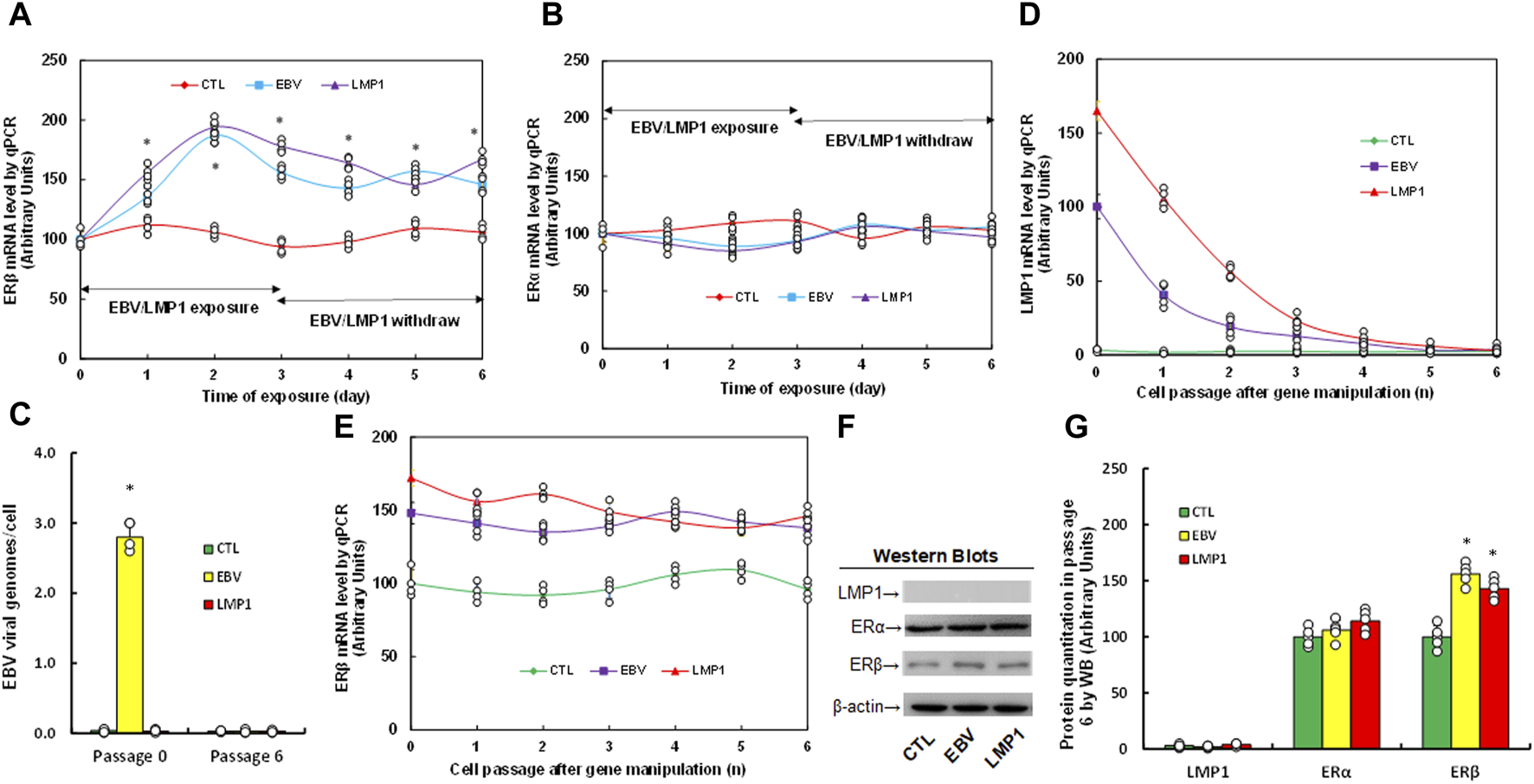 Transient exposure of EBV/LMP1 results in persistent ERβ upregulation. (A,B) Immortalized human HESC cells were treated by either control (CTL), EBV virus or LMP1 adenovirus for 3 days, then switched to control (CTL) for another 3 days, and the mRNA levels were determined for ERβ (A) and ERα (B). n = 4. *p < 0.05, vs. day 0 treatment. (C–G) Immortalized human HESC cells were treated by either control (CTL), EBV virus or LMP1 adenovirus for 3 days (passage 0), then switched to CTL for continuous culturing until passage 6 for biological assays. (C) EBV viral genomes, n = 4, *p < 0.05, vs. CTL in Passage 0. (D,E) mRNA levels for LMP1 (D) and ERβ (E), n = 4. (F) Representative western blots for (G). (G) Protein quantitation at passage 6. n = 5, *p < 0.05, vs. CTL group. Data were expressed as mean ± SD, one-way ANOVA was used for statistical analysis. Abbreviations EBV, Epstein-Barr virus; ERα, estrogen receptor α; ERβ, estrogen receptor β; LMP1, latent membrane protein 1; WB, Western blotting.