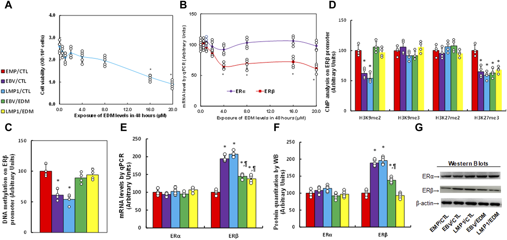 EDM suppresses ERβ expression through epigenetic modification on the ERβ promoter. (A,B) Immortalized human HESC cells were exposed to different concentrations of evodiamine (EDM), which including 0.0, 0.5, 1.0, 2.0, 4.0, 8.0, 12.0, 16.0 and 20.0 µM, after incubation of 48 h, cells were harvested for the analysis of cell viability (A) and mRNA levels (B). n = 5, *p < 0.05, vs. 0.0 µM EDM. (C–G) Immortalized human HESC cells at passage 6 were pre-treated with empty (EMP), EBV or LMP1 adenovirus, then exposed to either control (CTL) or 4.0 µM of EDM for 48 h, then the cells were harvested for subsequent biological assays. (C) DNA methylation, n = 4. (D) ChIP analysis on the ERβ promoter, n = 4. (E) mRNA levels, n = 4. (F) Protein quantitation, n = 5. (G) Representative western blots for (F). *p < 0.05, vs. EMP/CTL group; ¶p < 0.05, vs. EBV/CTL treatment. Data were expressed as mean ± SD, one-way ANOVA was used for statistical analysis. Abbreviations ChIP, chromatin immunoprecipitation; EBV, Epstein-Barr virus; EDM, evodiamine; ERα, estrogen receptor α; ERβ, estrogen receptor β; LMP1, latent membrane protein 1.