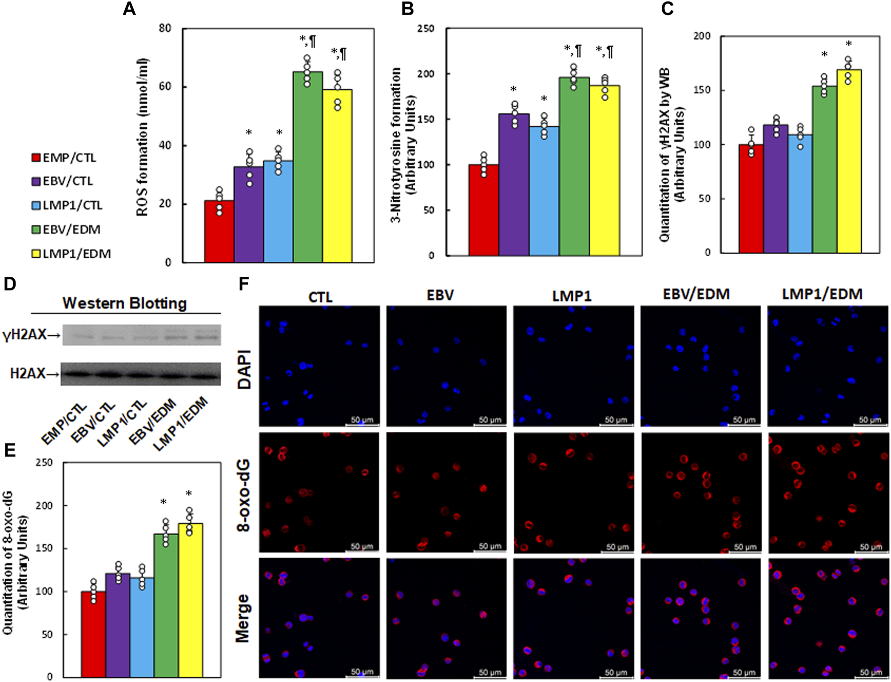 Immortalized human HESC cells underwent pre-treatment with EMP, EBV, or LMP1, followed by treatment with either CTL or 4.0 µM of EDM for 48 h at passage 6 for the measurement of oxidative stress. The findings indicated that pre-treatment with either EBV or LMP1 significantly augmented ROS formation (see Figure 3A) and 3-nitrotyrosine (see Figure 3B) in comparison to the EMP/CTL group. Interestingly, EDM treatment further intensified this effect. Conversely, pre-treatments with EBV/LMP1 had no notable impact on γH2AX formation (see Figures 3C, D; Supplementary Figure S1C) and 8-oxo-dG generation (see Figures 3E, F) in comparison to the EMP/CTL group. However, EDM treatment significantly increased the formation of both γH2AX and 8-oxo-dG. In conclusion, EDM treatment modulates EBV exposure-mediated redox balance in HESC cells.